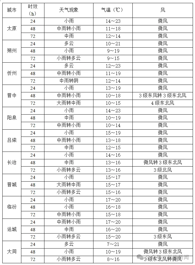 阴天还会持续,全省仍有小到中雨,临汾、吕梁、长治、晋中的部分地方,以及太原、阳泉的局部,可能下大雨;临汾、长治的局部可能下暴雨。北部局部和中南部部分地方依旧可能有雾或轻雾。