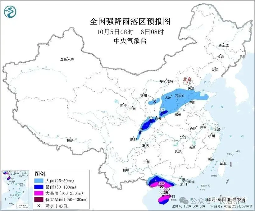 今年第21号台风“麦德姆”今天(10月5日)将登陆琼粤一带,受其影响,今明天,海南、广东、广西、云南等地将陆续进入本次台风雨的核心时段,部分地区有大暴雨,局地特大暴雨。同时,北方雨带有所北抬,陕西、山西、河北、河南、山东部分地区有大雨,局地暴雨。