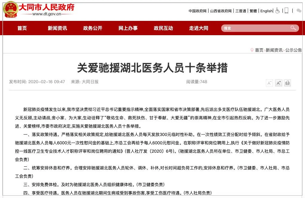 2 月 16 日,大同市人民政府官网发布《关爱驰援湖北医务人员十条举措》。一、落实政策待遇。严格落实相关政策规定,给驰援湖北医务人员每天发放 300 元临时性补助。在一次性绩效工资分配时给予倾斜。在省财政给予驰援湖北医务人员每人 6000 元一次性慰问金的基础上,市总工会再给予每人 6000 元慰问金。在职称评审和岗位聘用上,执行《关于做好新冠肺炎疫情防控一线医疗卫生专业技术人才职称评审和岗位聘用的通知》(晋人社厅发〔2020〕6号)。(驰援湖北医务人员所在单位、市卫健委、市人社局、市总工会负责)二、统筹安排休息和疗养。合理安排驰援湖北医务人员轮休、调休、补休,对长时间超负荷工作的,安排休息和疗养。(市卫健委、市人社局、市总工会负责)三、安排免费体检。及时为驰援湖北医务人员组织健康体检。(市卫健委负责)四、享受医疗待遇。医务人员在驰援湖北期间生病或受到事故伤害,享受工伤医疗待遇。(市人社局负责)五、办理商业保险。为驰援湖北医务人员办理包括人身医疗、伤残、身故等内容的保险保障。(市金融办负责)六、表彰奖励先进。市、县(区)党委政府在表彰奖励疫情防控工作人员时,对驰援湖北医务人员给予倾斜。在年度考核中,可为驰援湖北医务人员单列核定优秀等次指标。(市卫健委、市人社局负责)七、优先职务提拔和发展入党。对我市驰援湖北的医务工作者,表现突出的,优先提拔重用;培养考察期未满一年的入党积极分子或发展对象,向党组织提出入党申请,且本人一贯表现好、符合党员条件的,及时吸收为预备党员,不受发展党员指导性计划限制。(市委组织部负责)八、享受子女就学照顾。驰援湖北医务人员子女三年内入幼儿园的,根据家长意愿,安排在普惠性优质幼儿园。子女近三年内入学小学和初中学校的,纳入政策照顾对象。今年参加中考的,享受中考成绩加 30 分政策。子女就读期间,由所在学校指定专门教师提供课业辅导、心理疏导等。今年参加中考、高考的,由所在学校指定专门教师对其备考应考、志愿填报等提供专项指导。(市教育局、所在县区人民政府负责)九、建立「关爱后援团」。医务人员驰援湖北期间,由县(区)人民政府确定县级领导对其医务人员家庭进行包联,为其解决困难。其未成年子女、高龄老人无人照看的,由县(区)人民政府安排托管照顾和送教服务。(市卫健委、所在县区人民政府负责)十、开设爱心热线。为驰援湖北医务人员家属提供心理咨询服务,帮助缓解心理压力,热线电话:2309222(工作日 9 时至 17 时),13753299288(24 小时)。(市卫健委、市民政局负责)市卫健委负责提供驰援湖北医务人员名单。各责任单位负责制定关爱举措的实施细则,并将落实情况于 2 月 20 日前报市委、市政府。此前,湖北省人民政府办公厅也曾发布措施,提出一线医务人员子女 2020 年参加中考的,可在其录取总分基础上增加 10 分后参加中考招生录取等措施。信息来源:大同市人民政府官网、湖北权威发布 微信号
