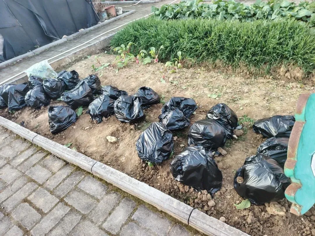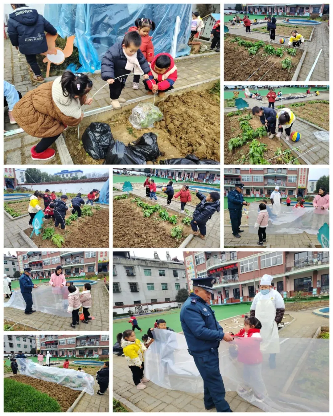 在保安叔叔的指导下,大家一起找了许多塑料袋,一起动手开始给莴笋穿上过冬的“衣服”,还给塑料袋的旁边压上许多小石头,以防小朋友不在的时候风把“衣服”吹走了。