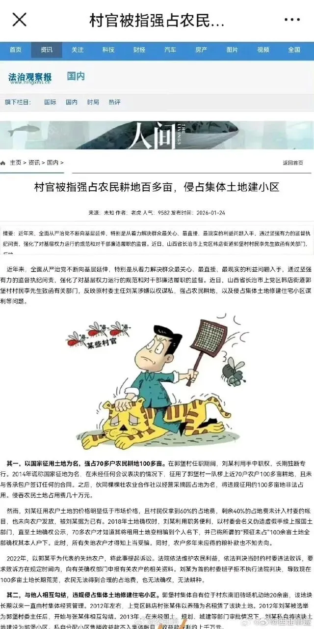 近年来,全面从严治党不断向基层延伸,特别是从着力解决群众最关心、最直接、最现实的利益问题入手,通过坚强有力的监督执纪问责,强化了对基层权力运行的规范和对干部廉洁履职的监督。近日,山西省长治市上党区韩店街道郭堡村村民李先生致函有关部门,反映原村委主任刘某涉嫌以权谋私,强占农民耕地,以及侵占集体土地修建住宅小区谋利等问题。