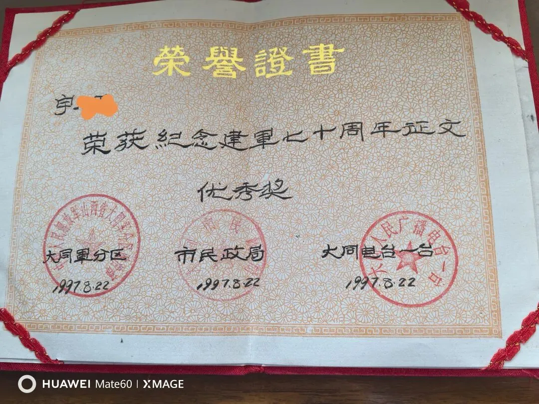 这件事我在部队时曾参加了大同电台的征文获奖。如今已经已经三十多年,但是每当看到这个早已泛黄的证书,马警官的哪句“一家人”!犹如那晚旅店小老板煮的那碗热气腾腾的方便面,仍然烫的人眼眶发酸。