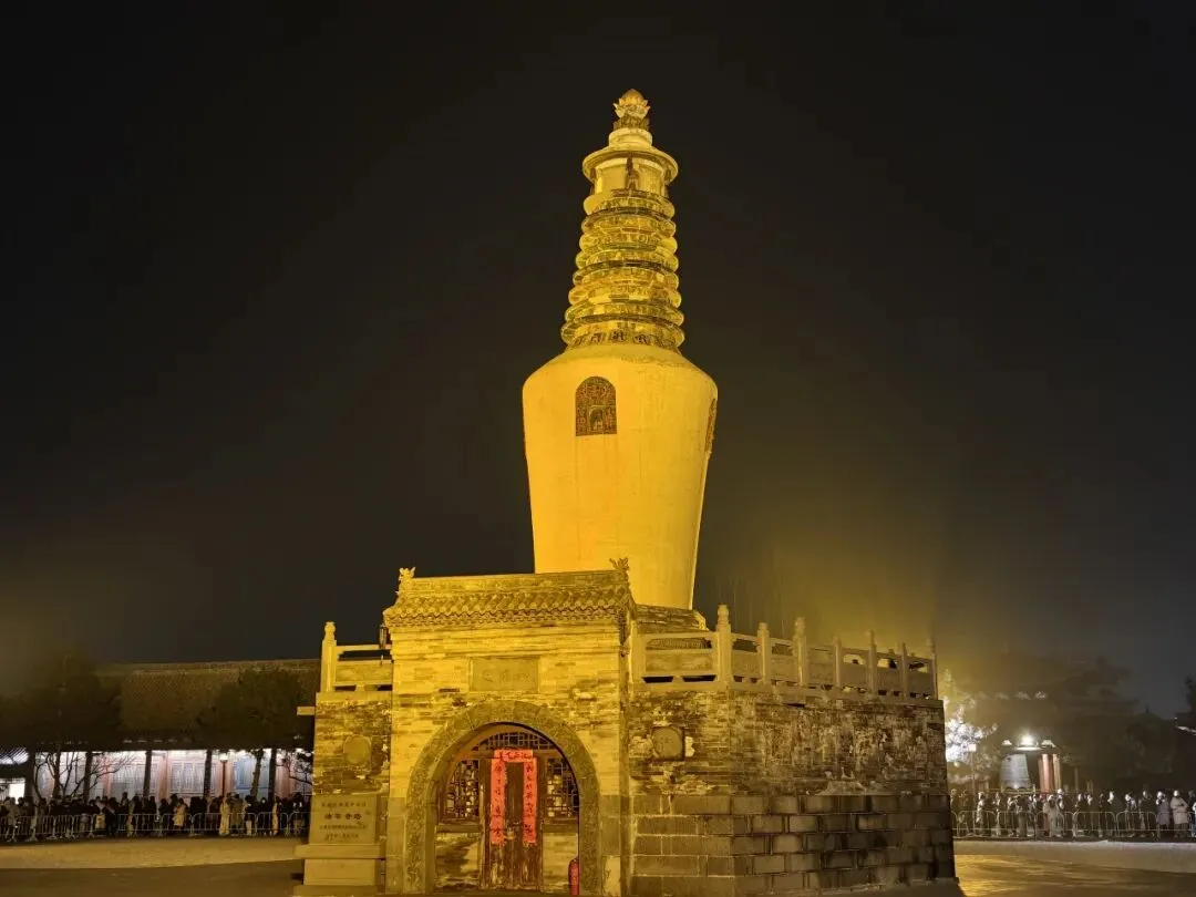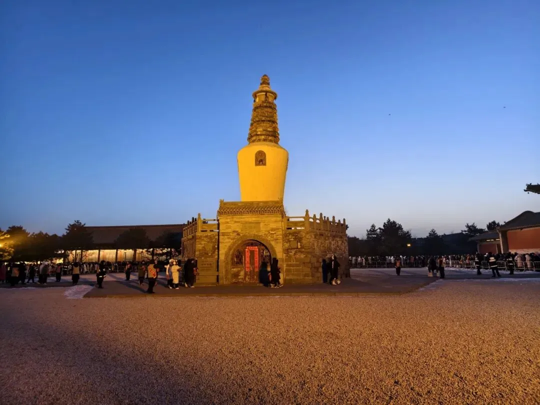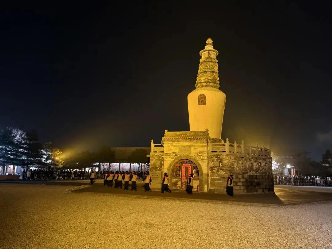 2019年也领过一次,当时在法华寺的琉璃牌坊外施粥,排队秩序全靠人人自觉。现在将队伍移到内院,围着白塔按紫蓝黄绿四色排队,有围栏以及俗家弟子、义工、警察、志愿者等好多工作人员在周边维持秩序。