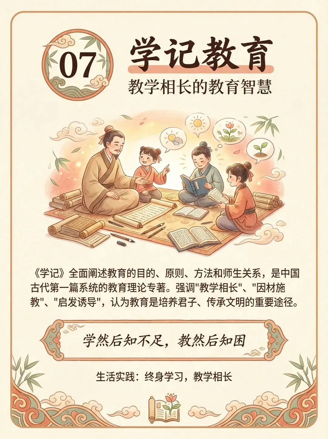 “教学相长”的理念打破了教与学的单向关系;“道而弗牵,强而弗抑,开而弗达”的启发式教学原则,至今仍是教育学中的黄金法则。