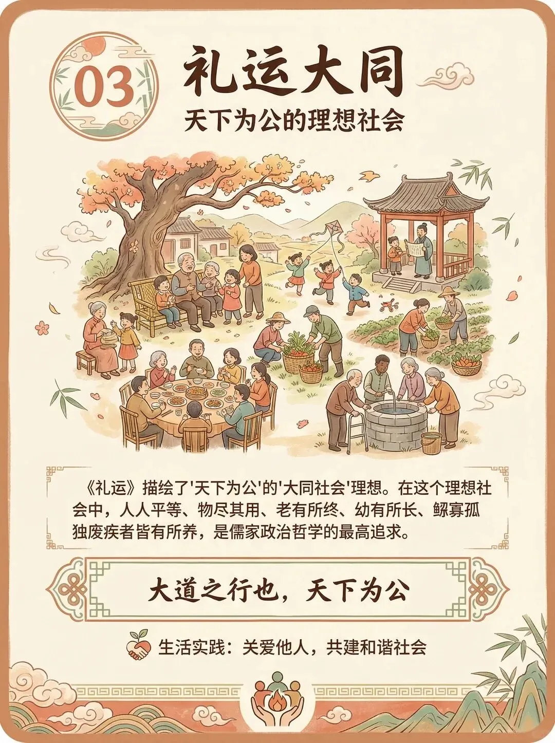 《礼运·大同篇》勾勒了中国思想史上极动人的社会愿景:“大道之行也,天下为公,选贤与能,讲信修睦。故人不独亲其亲,不独子其子,使老有所终,壮有所用,幼有所长,矜寡孤独废疾者皆有所养......”
