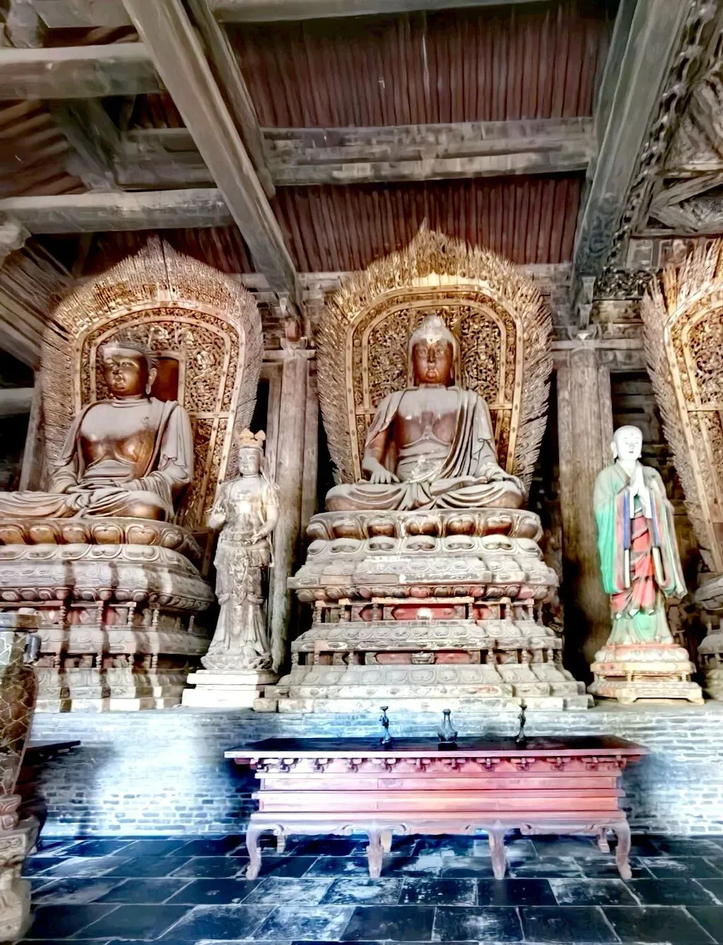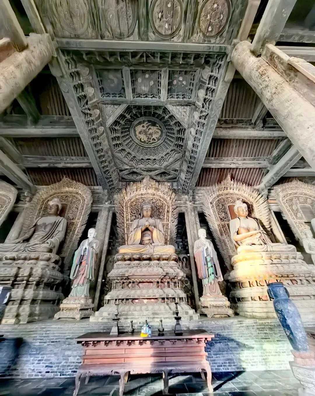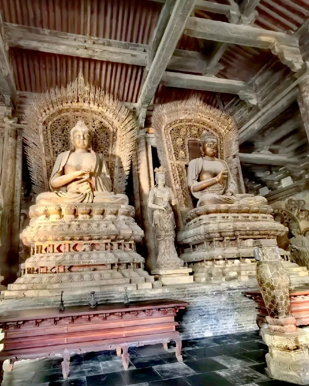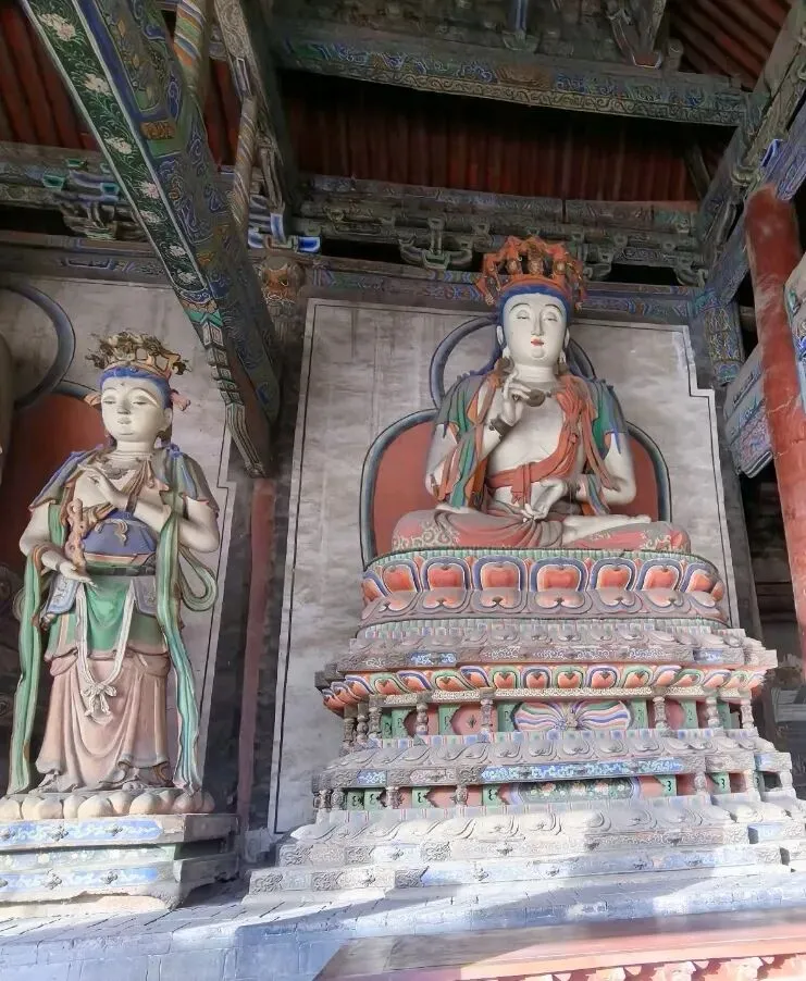 在大雄宝殿左右,分别是东西朵殿 。东侧原为文殊阁,可惜民国时被烧毁,如今的是后人仿制的;西侧是普贤阁,保留着辽时原迹,是一座单檐九脊顶方形楼阁 。寺院其余两侧配殿和钟鼓楼则为明清时期建筑,与辽金建筑相互映衬,构成了善化寺完整的建筑格局。
