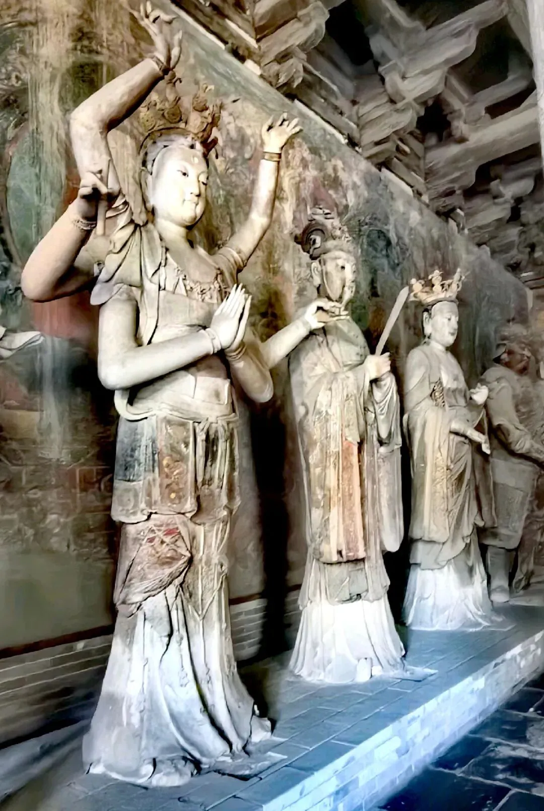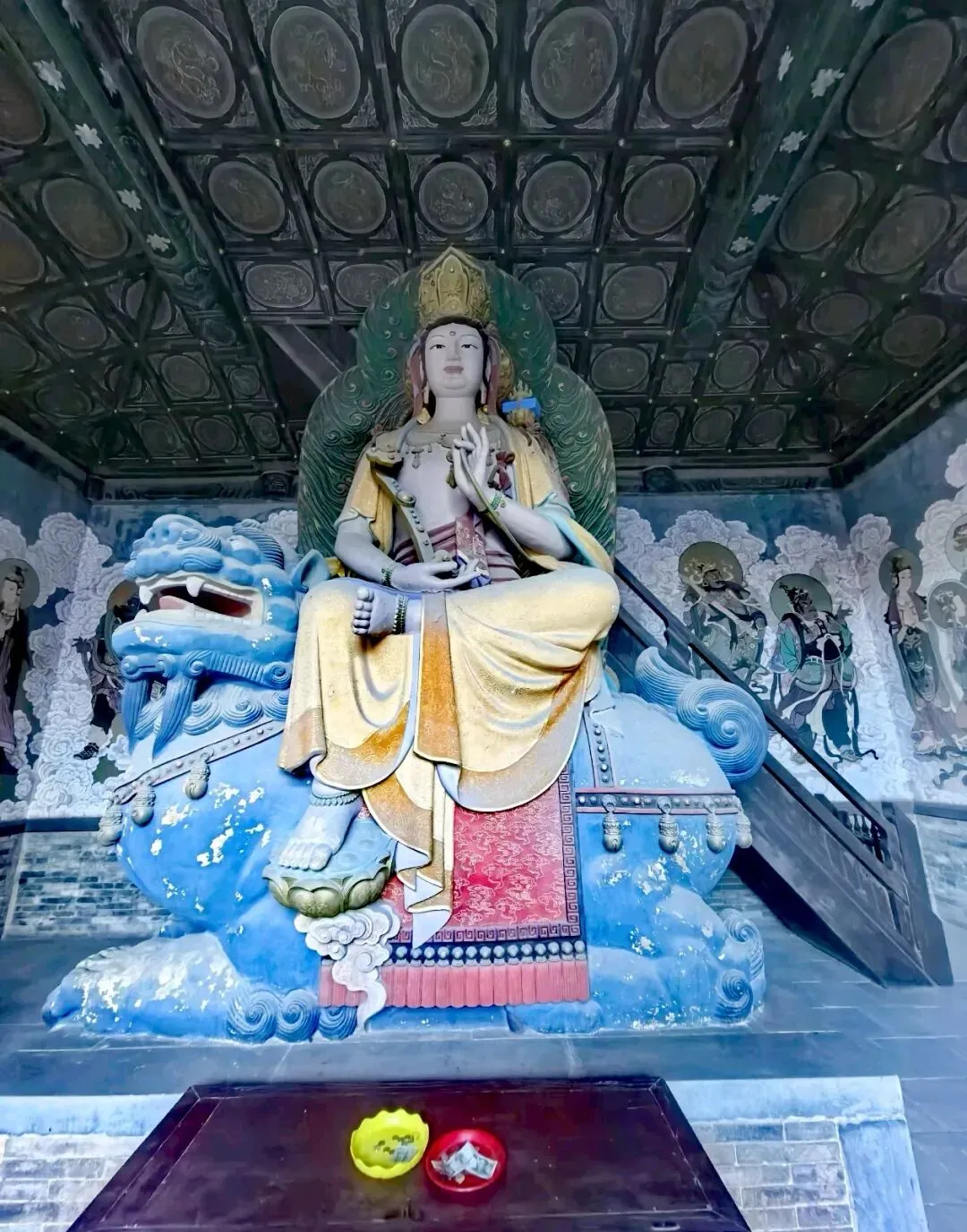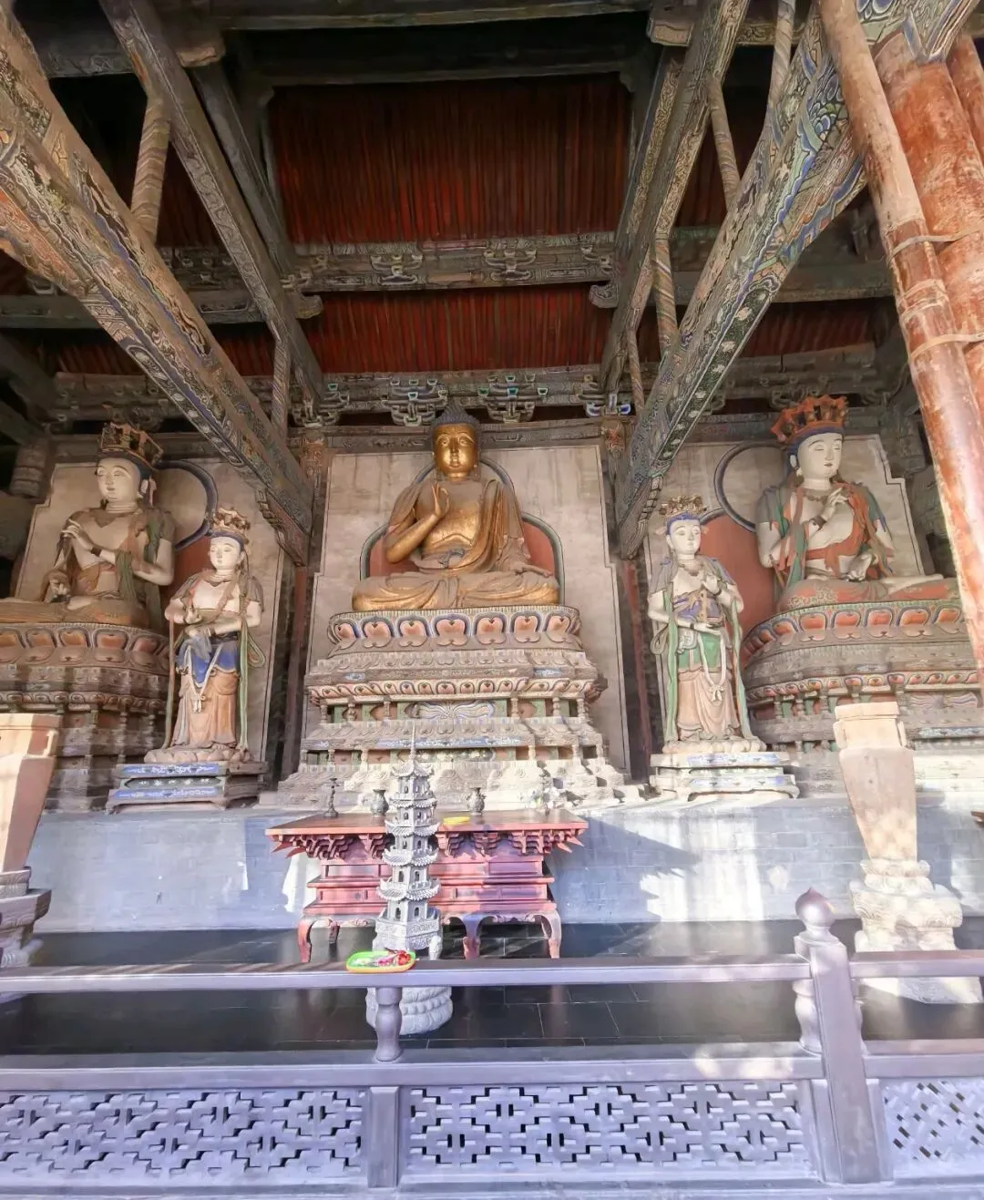 在大雄宝殿左右,分别是东西朵殿 。东侧原为文殊阁,可惜民国时被烧毁,如今的是后人仿制的;西侧是普贤阁,保留着辽时原迹,是一座单檐九脊顶方形楼阁 。寺院其余两侧配殿和钟鼓楼则为明清时期建筑,与辽金建筑相互映衬,构成了善化寺完整的建筑格局。