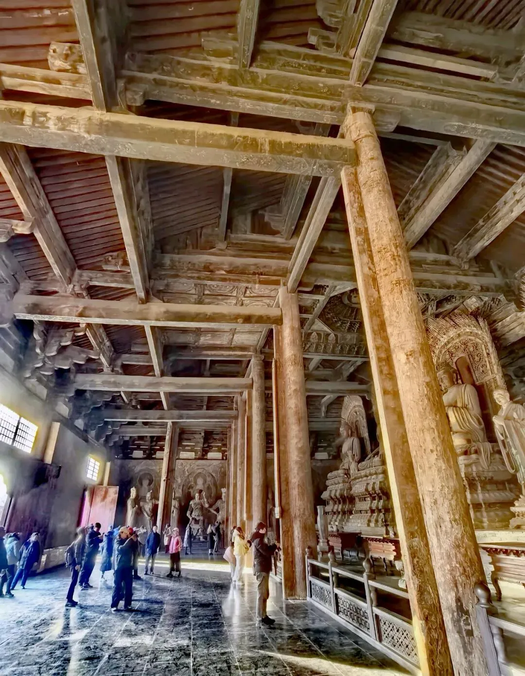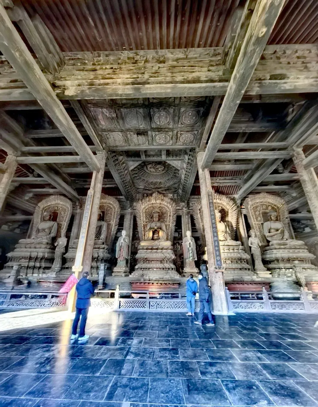 主殿大雄宝殿,是最体现盛唐雄浑之气和辽金豪放之风的建筑;大殿位于3米多高的月台之上,气势恢宏,就像一只展翅欲飞的大鸟,被梁思成赞为“伟大之斗拱,深远之檐出”的斜拱,形如怒放的花朵,把古建的雄浑之美表现的淋漓尽致;大殿面阔7间(46.7米),进深5间(25.5米),单檐五脊顶,作为辽代建筑,以单位面积排名全国第三,八根木柱撑起一个宏大的殿堂,不得不惊叹古代工匠们对减柱法的纯熟运用,最为精妙的是顶部仅在当心间有平棋藻井两间,其余都是露明造,大殿梁架一目了然;大殿内正中佛坛上硕大的莲花宝座上端座着如来五方佛,从东往西依次排列东方阿閦佛、南方宝生佛、中央毗卢遮那佛、西方阿弥陀佛、北方微妙闻佛,法相庄严、凝重典雅、衣纹流畅,莲座下还有弟子、菩萨侍立,是辽金原作。
