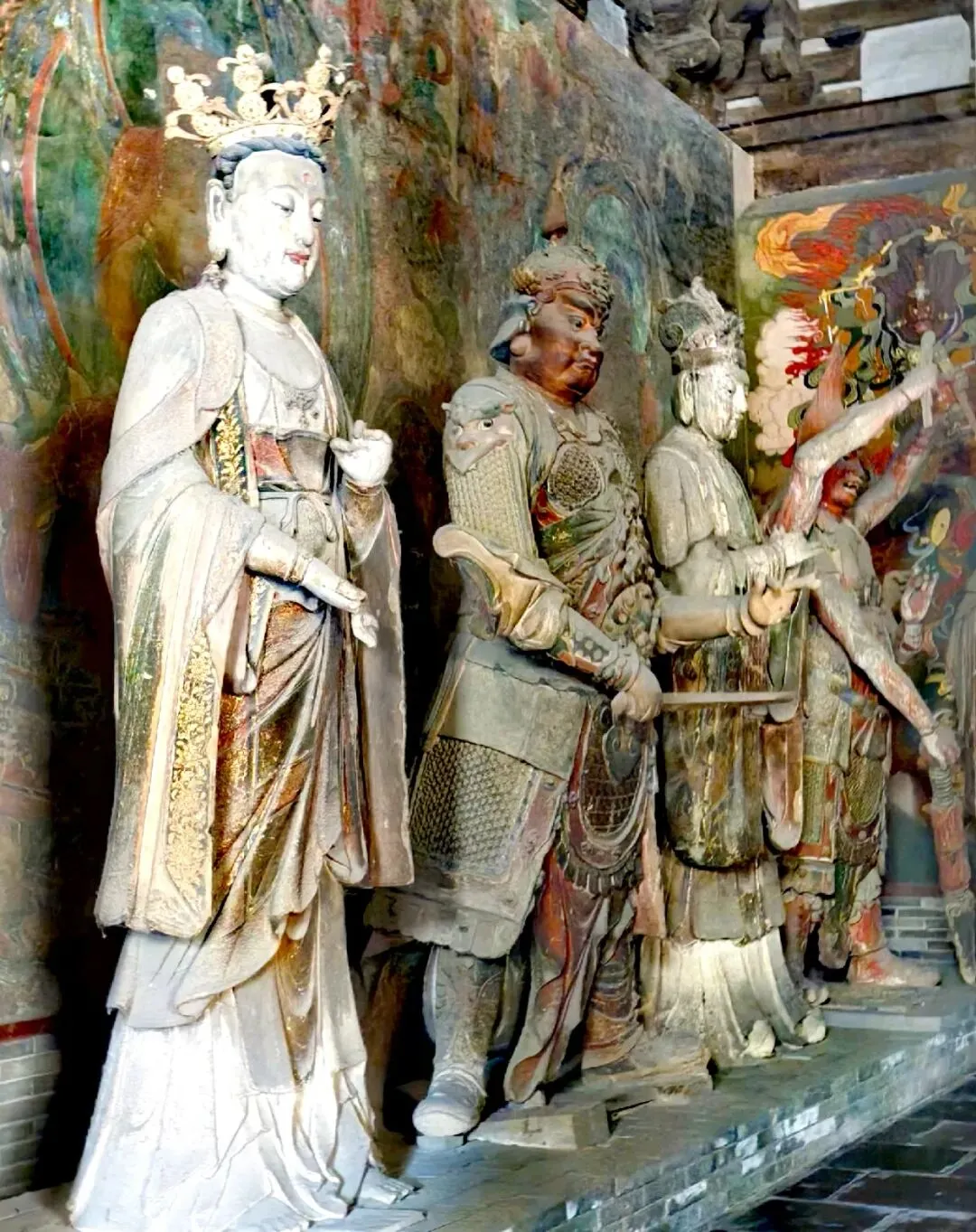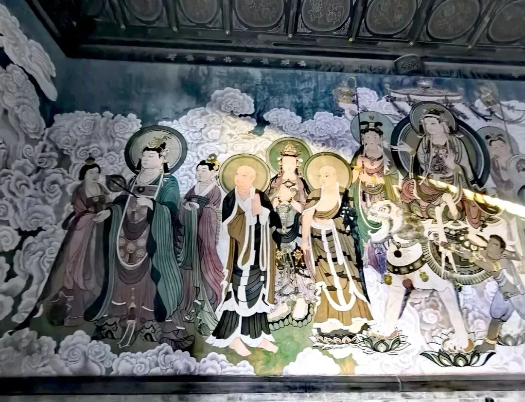 殿内东西两侧砖台上置有24诸天尊像,神态各异,体态丰伟,性格鲜明,既有武将的威武,又有文官的儒雅,生活气息浓郁,极富感染力,殿内西南两壁上有清康熙二十五年(1686)至四十七年(1708)所绘的壁画,内容均为佛教故事。