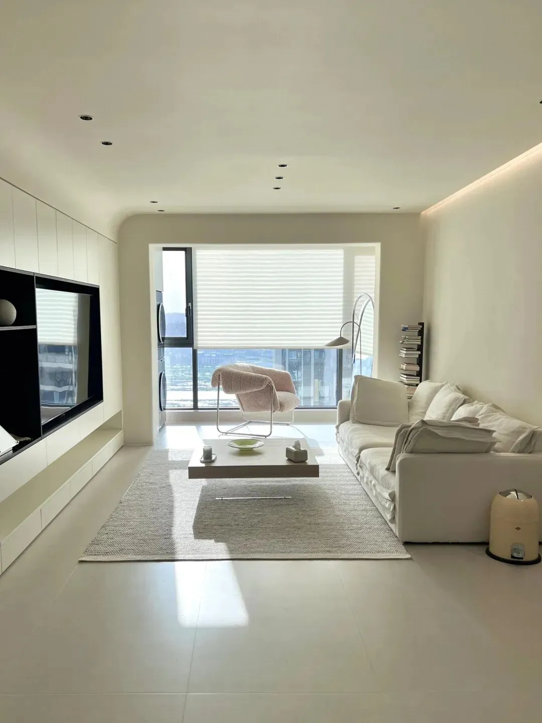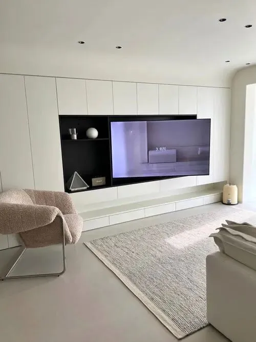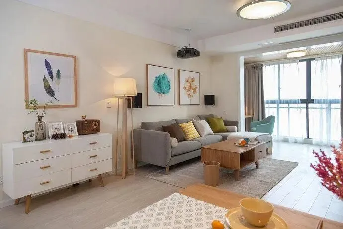 二、客厅:宽敞明亮,简约大气,收纳隐形。客厅是家人休闲、娱乐、接待客人的核心区域,肖邦设计师采用浅色系为主色调(白色墙面+浅灰色地砖),提升客厅的明亮度和通透感,缓解小空间的拥挤感。地砖选用600*600的浅灰色喷墨地砖,耐脏、耐擦洗,适合有孩子的家庭,同时适配太原干燥气候,不易出现开裂、变形的情况。客厅电视背景墙没有做复杂的造型,而是设计了定制电视柜+悬浮收纳柜,电视柜采用悬空设计,避免地面积灰,方便清洁,同时增加收纳空间,可收纳电视、机顶盒、遥控器等物品;悬浮收纳柜则可收纳书籍、摆件等杂物,让客厅更整洁,隐形收纳设计,既满足收纳需求,又不影响颜值。客厅沙发选用浅灰色布艺沙发,柔软舒适,搭配简约茶几,沙发旁边放置一个简约边几,可放置水杯、书籍等物品,实用又美观。客厅与阳台打通,扩大客厅空间,阳台设计定制收纳柜,收纳洗衣机、洗衣用品等,同时在阳台摆放一盆绿植,增添生机与活力,让客厅更有氛围感。