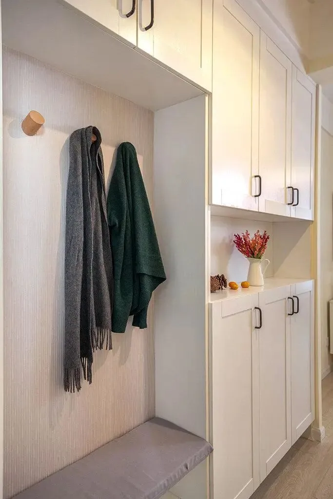 一、玄关:入户即收纳,整洁有序。玄关是入户的第一印象,也是太原业主日常进出换鞋、放杂物的核心区域,肖邦设计师在玄关设计了定制鞋柜+换鞋凳一体化组合,鞋柜分为上下两层,上层可放置包包、钥匙、帽子等小杂物,下层可收纳鞋子,中间预留开放格,放置常用物品(如雨伞、拖鞋),换鞋凳则方便家人进出换鞋,坐着换鞋更舒适。鞋柜采用浅灰色门板,搭配白色台面,简约大气,与整体装修风格保持一致,同时鞋柜底部预留10cm空隙,可放置常穿的拖鞋,不用频繁打开鞋柜,日常使用更便捷。玄关墙面涂刷浅灰色乳胶漆,搭配简约挂画,提升颜值,同时采用肖邦专属挂网工艺,做好墙面防裂处理,适配太原干燥气候,避免墙面开裂。