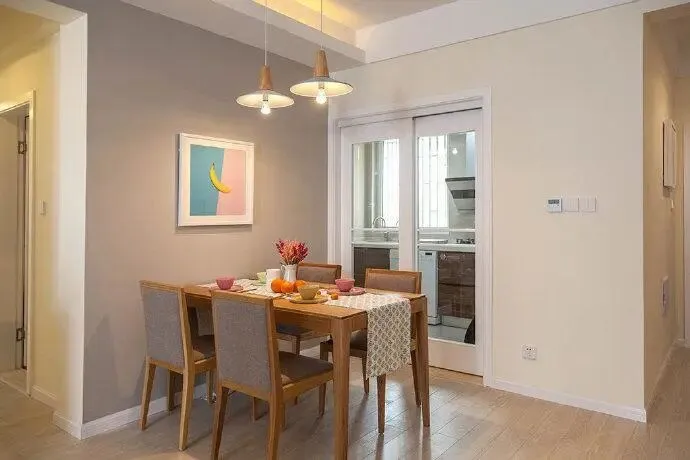 三、餐厅:小巧精致,收纳充足。餐厅紧邻厨房,设计紧凑但不拥挤,肖邦设计师在餐厅墙面设计了定制餐边柜,餐边柜与墙面紧密贴合,不占用多余空间,餐边柜分为上下两层,上层可放置餐具、酒杯等物品,下层可收纳杂物、零食等,同时预留开放格,放置常用的餐具、纸巾等,日常取用更便捷。餐桌选用圆形实木餐桌,搭配4把简约餐椅,圆形餐桌更节省空间,适合小面积餐厅,同时避免尖锐边角,保护孩子安全。餐厅墙面悬挂一幅简约的餐厅挂画,搭配暖光灯带,营造温馨的用餐氛围,让家人用餐更舒适。