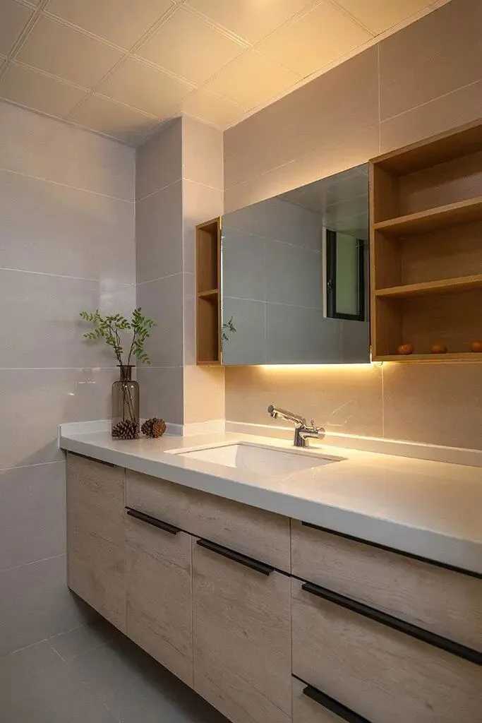 六、卫生间:干湿分离,整洁宽敞,收纳到位。卫生间采用干湿分离设计,安装透明玻璃隔断,将淋浴区与洗漱区隔开,避免淋浴时水溅到洗漱区,导致卫生间潮湿、积水,同时减少细菌滋生,日常清洁更省心。洗漱区设计定制浴室柜,浴室柜采用悬挂式设计,节省空间,同时避免地面积灰,浴室柜台面选用石英石台面,耐刮、耐脏,浴室柜内部可收纳洗漱用品、护肤品等物品,浴室柜上方安装一面圆形镜子,增加卫生间的明亮度,同时方便家人洗漱、整理仪容。淋浴区墙面设计壁龛,收纳洗发水、沐浴露等洗漱用品,省去五金挂件,让淋浴区更整洁、宽敞,淋浴区地面铺贴防滑地砖,避免滑倒,同时做好防水处理,杜绝卫生间漏水隐患。卫生间窗户选用断桥铝窗户,增加采光和通风,让卫生间更干燥,适配太原干燥气候。