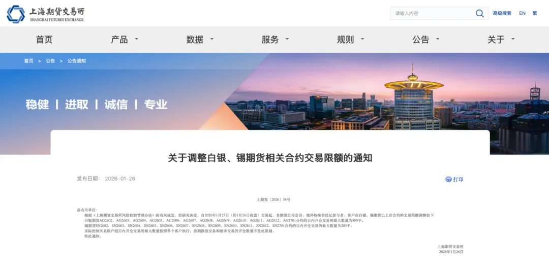 1月26日,上海期货交易所再次调整白银、锡和铜等期货品种相关合约交易限额、保证金比例和涨跌停板幅度,且对部分客户采取限制开仓等监管措施。
