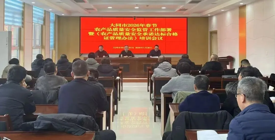 1月26日,大同市农业农村局召开大同市2026年春节农产品质量安全工作部署暨《农产品质量安全承诺达标合格证管理办法》培训会议,就春节期间农产品质量安全工作作了专题部署,同时围绕农业农村部2025年12月2日公布的《农产品质量安全承诺达标合格证管理办法》进行了系统培训。各县区农业农村局农产品质量安全分管领导、农业综合行政执法队负责同志、局相关部门参加了会议,局分管领导三级调研员曹林同志主持会议并讲话。