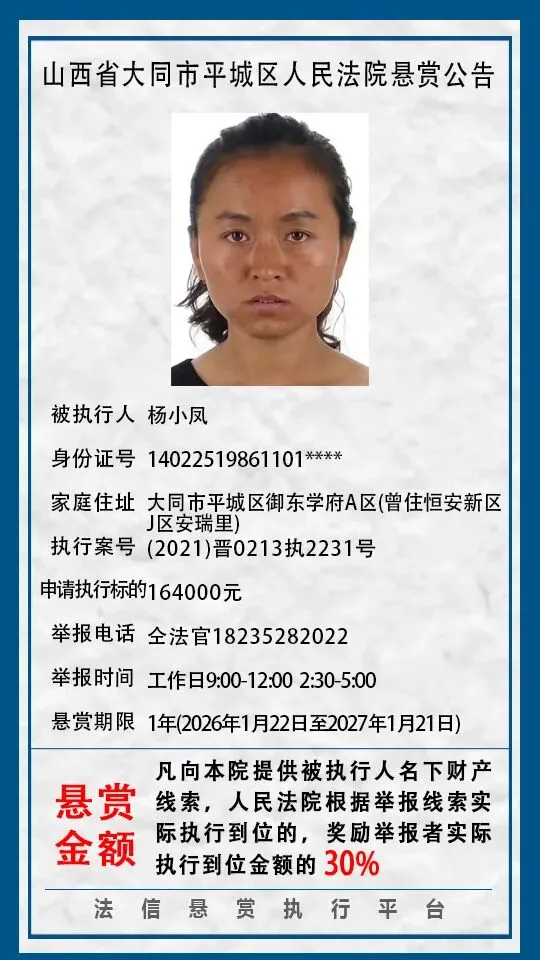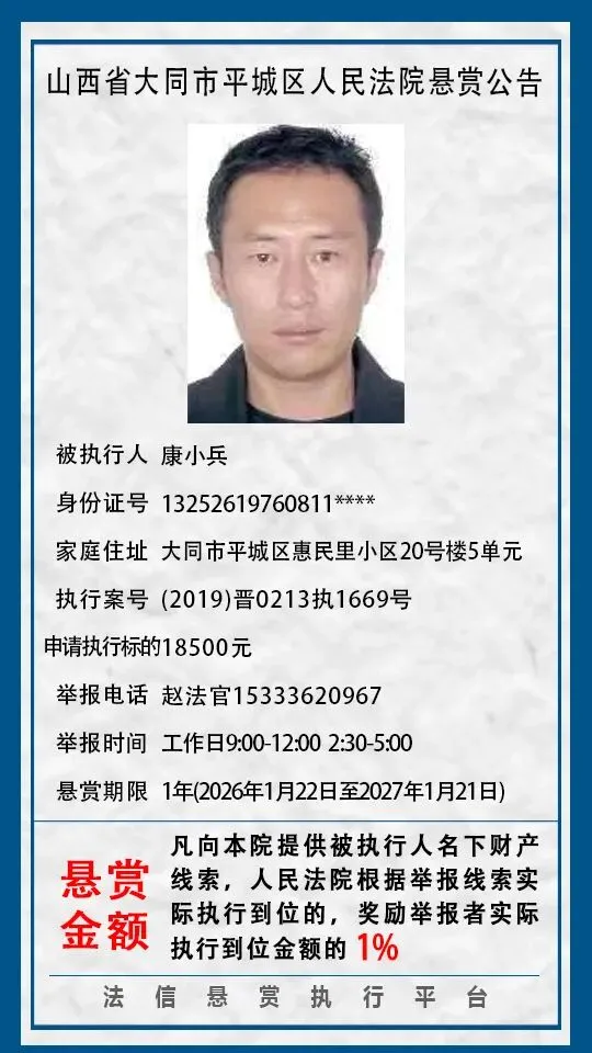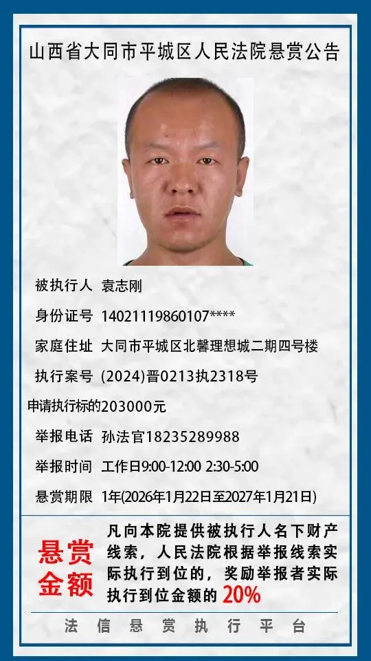 山西省大同平城区人民法院悬赏公告(2026年1月第一期)