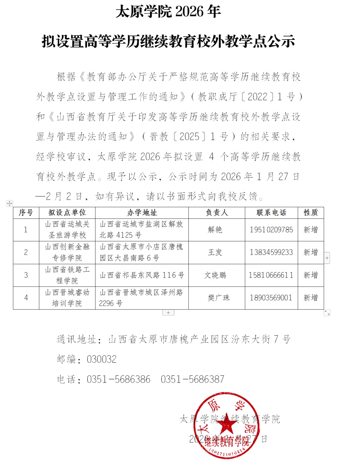 >太原学院2026年拟设置高等学历继续教育校外教学点公示