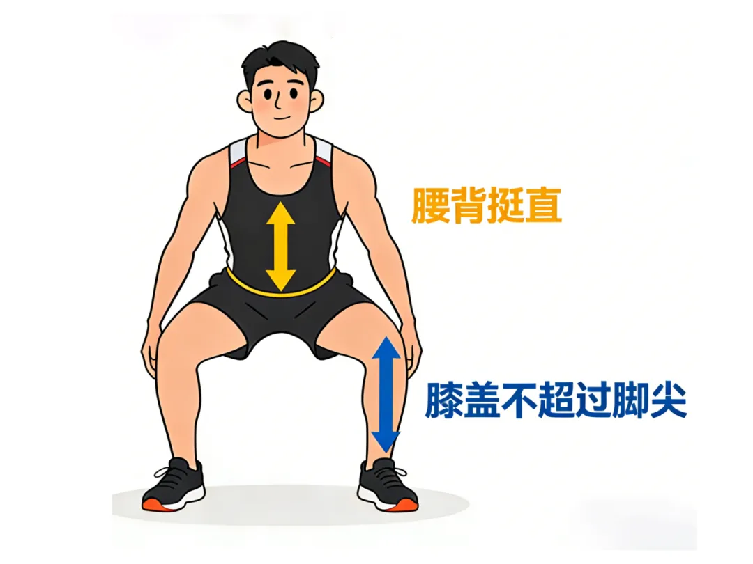 吸气下蹲,保持腰背挺直,膝盖不超过脚尖;