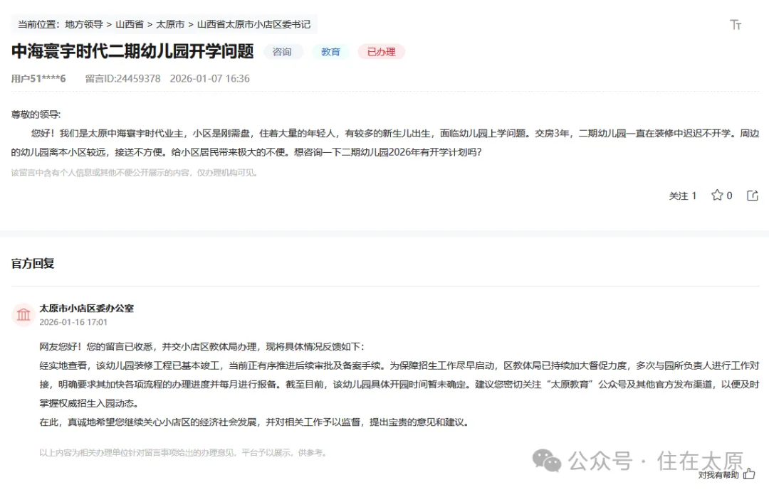 对此,官方回复称:经小店区教体局实地调查,目前该幼儿园的装修工程已基本完工,当前阶段正积极推进后续审批与备案手续的办理。为加快开园进程,区教体局已多次督促园方负责人,要求加快办理各项流程,并建立月度报备机制以跟踪进展。不过,具体的开园日期目前仍未能确定。有关部门建议业主密切关注“太原教育”等官方信息发布平台,以便及时获取准确的招生动态。