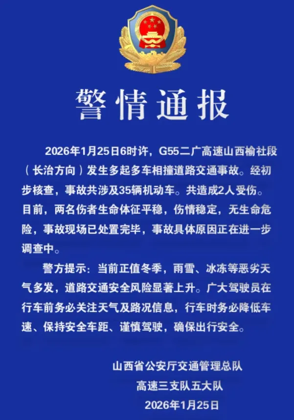 >35辆车相撞!二广高速榆社段(长治方向)!警情通报!