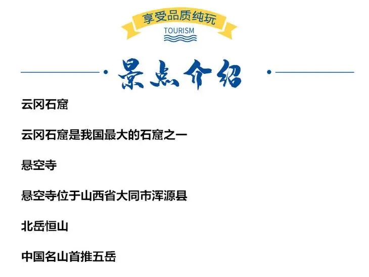 【门票】:恒山45元,云冈石窟120元,悬空寺外观门票15元(自行提前景区微信公众号预约门票)以上门票价格仅供参考,以景区实际规定为准。