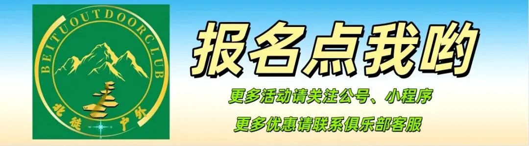 ①仔细阅读行程,装备要求,费用说明,注意事项后决定是否报名;②确定报名后联系北徒户外主理人(大建),备注:参加活动名称;③报名需提供:姓名+身份证号码+电话,用于购买保险。报名方式:2(点击小程序进入报名界面)