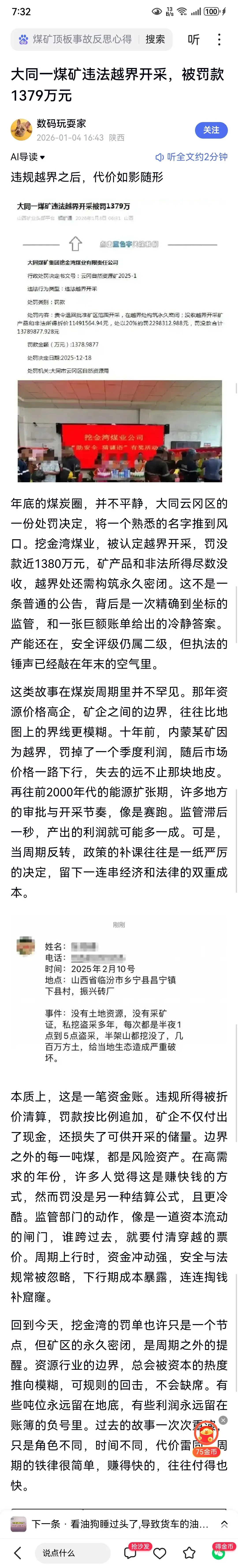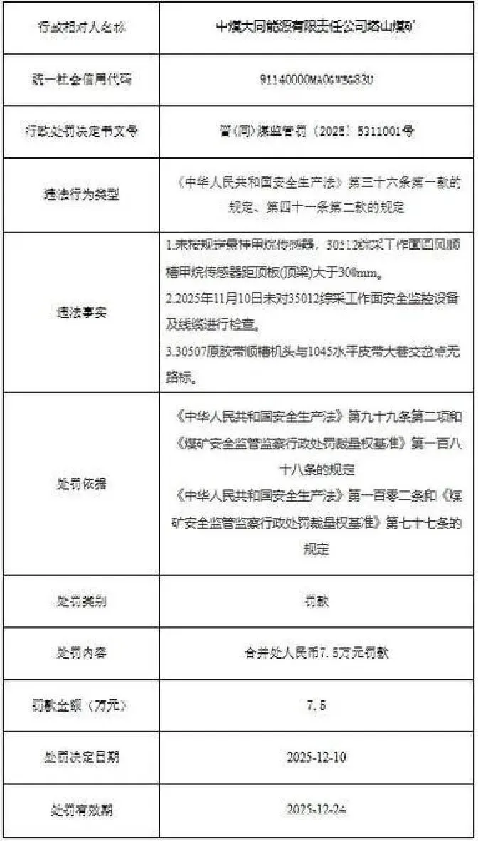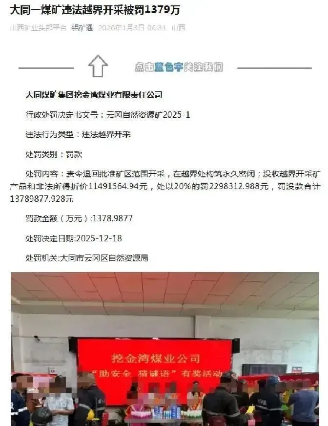 年底的煤炭圈,并不平静,大同云冈区的一份处罚决定,将一个熟悉的名字推到风口。挖金湾煤业,被认定越界开采,罚没款近1380万元,矿产品和非法所得尽数没收,越界处还需构筑永久密闭。这不是一条普通的公告,背后是一次精确到坐标的监管,和一张巨额账单给出的冷静答案。产能还在,安全评级仍属二级,但执法的锤声已经敲在年末的空气里。