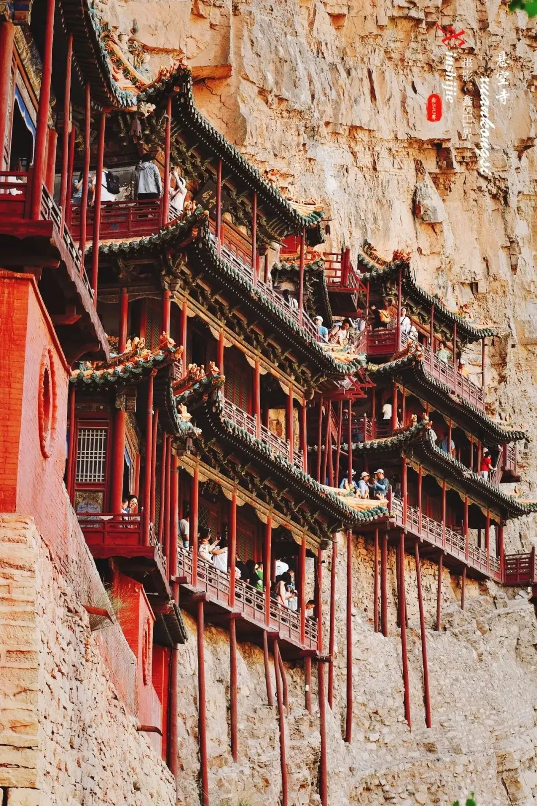 “石屏千仞立,古寺半空悬,现存建筑是明清修缮的。登临要排队缓慢的向上,栈道很窄,上为木栈道,下为石栈道,属于全木质榫卯结构,并不是靠几十根木柱支撑,而是以插入岩壁的横梁为基础,同时与回廊栏杆上下梁柱形成框架式结构,这就是千年不倒的秘密,悬空寺木梯上的莲花图案,寓意"步步登莲,吉祥如意"也是古诗一绝,也是罕见的佛、道、儒三教合一的寺庙。