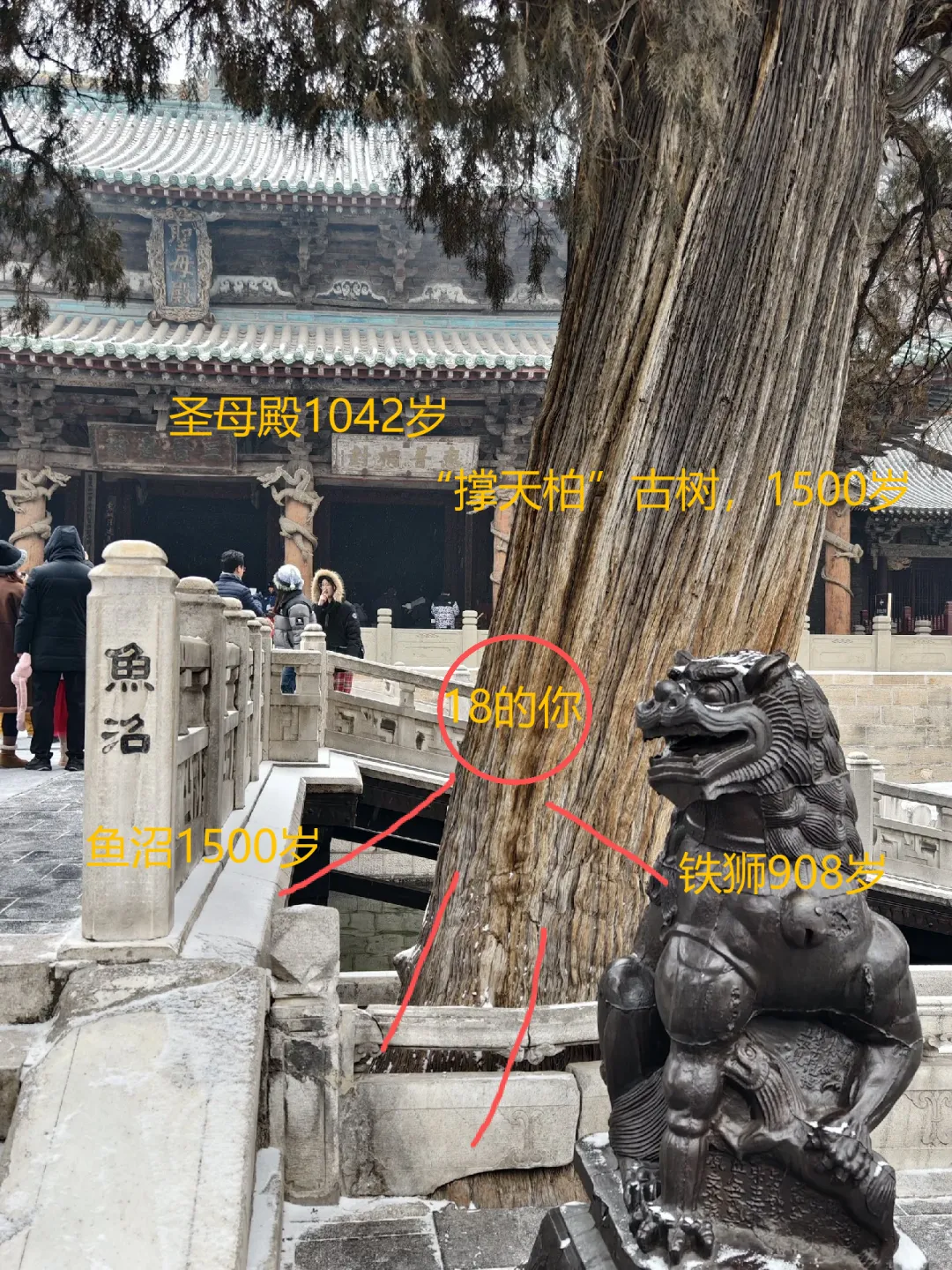 来晋祠,和北宋太平兴国年间建成的圣母殿、北魏时期的鱼沼飞梁、1500 岁的‘撑天柏’,还有北宋政和年间铸就的铁狮一起拍照打卡。让我们和这些千年古迹同框,来一次跨越时空的浪漫。