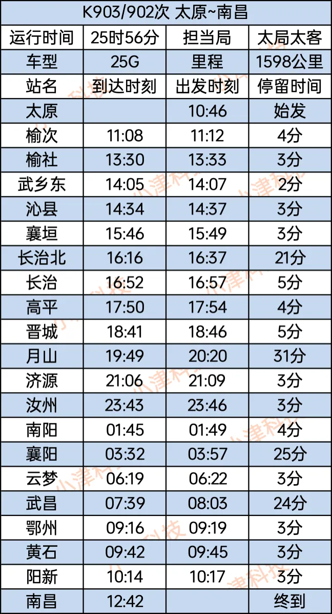 2026年1月26日起,K903/902 K904/901次改为南昌站始发终到,九里垄至南昌经由京九铁路运行,太原至长治北区间改由复兴号内燃机车FXN5C牵引。