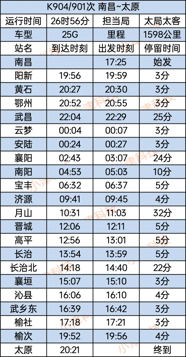 南昌站至太原站K904/901次全程运行26小时56分 ,经停南昌17:25始发,经停阳新、黄石、鄂州、武昌、云梦、安陆、襄阳、南阳、宝丰、济源、月山、晋城、高平、长治、长治北、襄垣、沁县、武乡东、榆社、榆次,次日21:21终到太原站。
