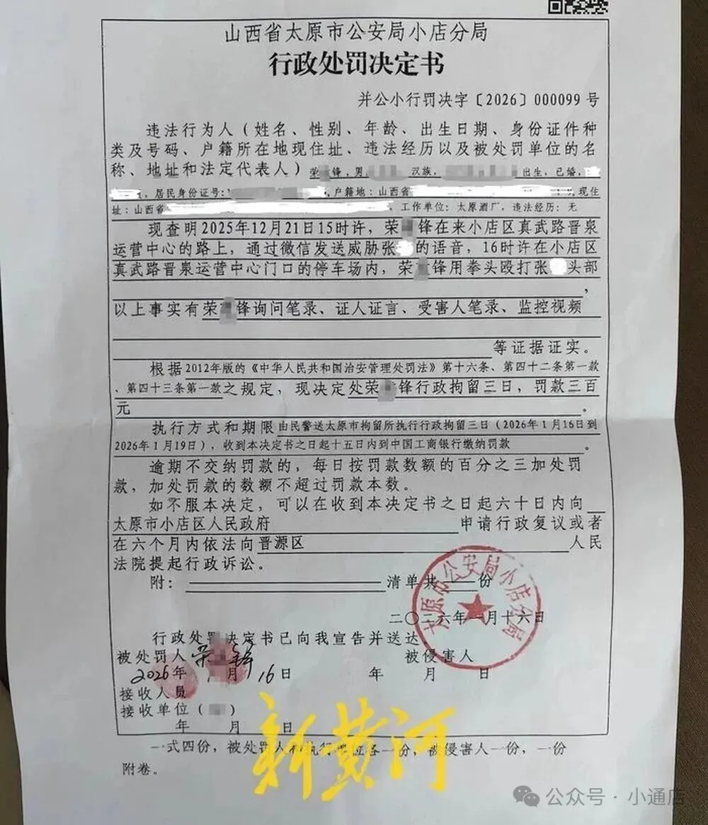 1月16日,太原市公安局小店分局对荣某锋作出的行政处罚决定书称,现查明,2025年12月21日15时许,荣某锋在来小店区真武路晋泉运营中心的路上,通过微信发送威胁张先生的语音,16时许在小店区真武路晋泉运营中心门口的停车场内,荣某锋用拳头殴打张先生头部。根据《中华人民共和国治安管理处罚法》相关规定,现决定处荣某锋行政拘留3日,罚款300元。