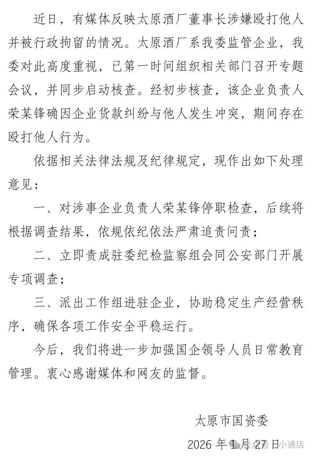 近日,有媒体反映太原酒厂董事长荣某锋涉嫌殴打他人并被行政拘留的情况。太原酒厂系我委监管企业,我委高度重视,第一时间启动核查。经初步核查,荣某锋确因企业货款纠纷与他人发生冲突,期间存在殴打他人行为。