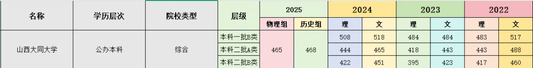 2025年,山西大同大学物理专业组的院校投档线最低为465分,位次在本省排名87339。历史专业组的院校投档线最低为468,位次在本省排名29132。(下图为山西大同大学2022-2025年院校最低投档线)