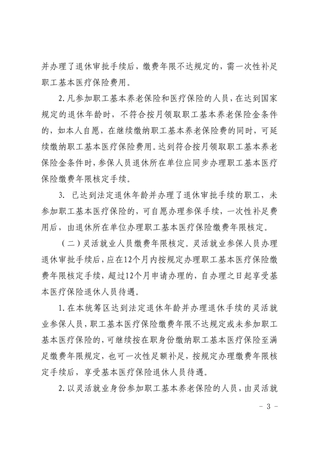 1.在本统筹区达到法定退休年龄并办理退休手续的灵活就业参保人员,职工基本医疗保险缴费年限不达规定或未参加职工基本医疗保险的,可继续按在职身份缴纳职工基本医疗保险至满足缴费年限规定,也可一次性足额补足,按规定办理缴费年限核定手续后,享受基本医疗保险退休人员待遇。