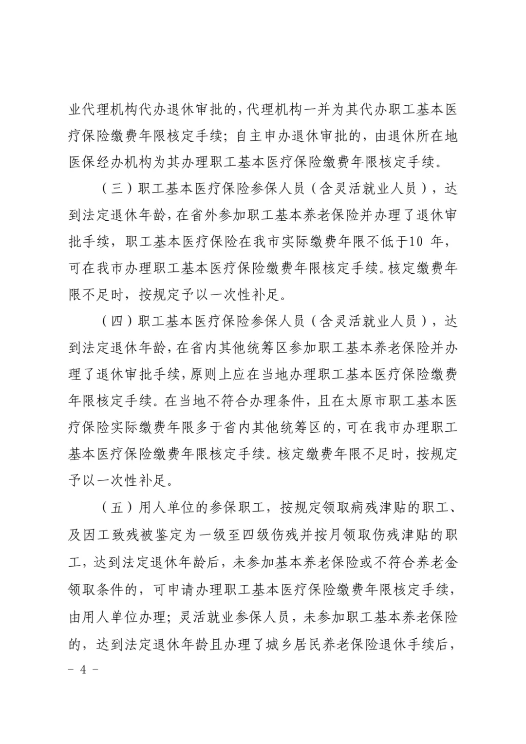 (四)职工基本医疗保险参保人员(含灵活就业人员),达到法定退休年龄,在省内其他统筹区参加职工基本养老保险并办理了退休审批手续,原则上应在当地办理职工基本医疗保险缴费年限核定手续。在当地不符合办理条件,且在太原市职工基本医疗保险实际缴费年限多于省内其他统筹区的,可在我市办理职工基本医疗保险缴费年限核定手续。核定缴费年限不足时,按规定予以一次性补足。