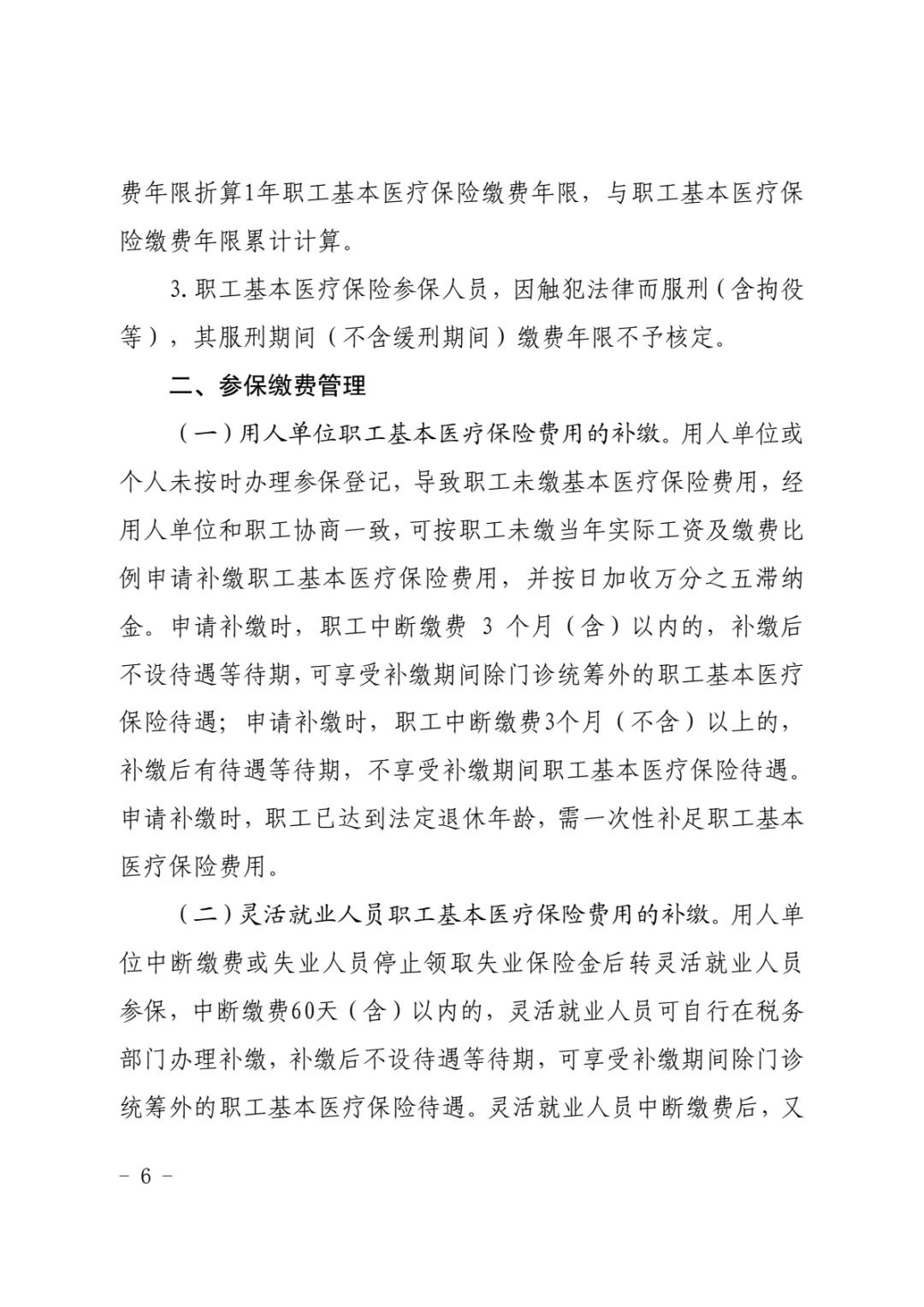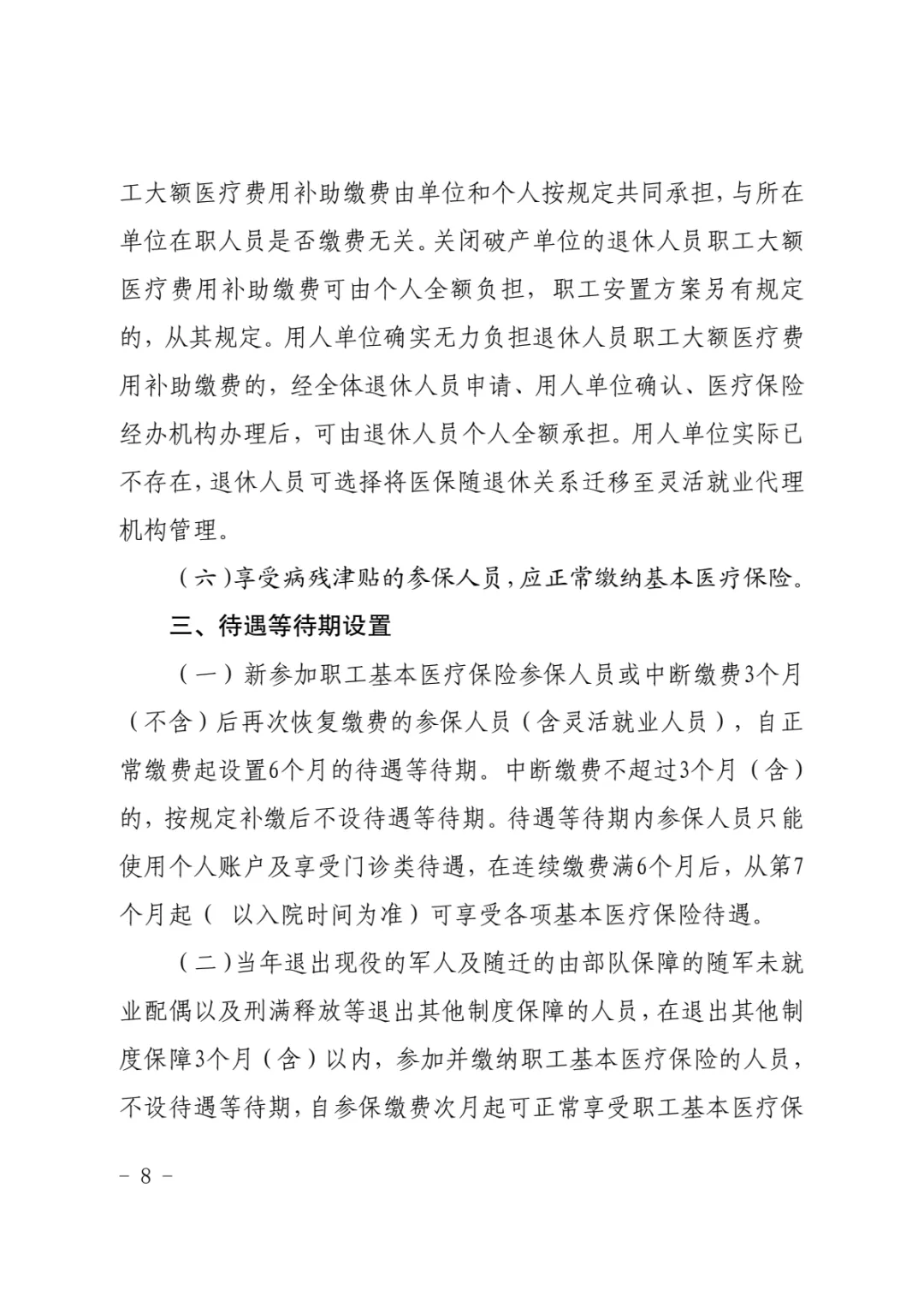 (一)新参加职工基本医疗保险参保人员或中断缴费3个月(不含)后再次恢复缴费的参保人员(含灵活就业人员),自正常缴费起设置6个月的待遇等待期。中断缴费不超过3个月(含)的,按规定补缴后不设待遇等待期。待遇等待期内参保人员只能使用个人账户及享受门诊类待遇,在连续缴费满6个月后,从第7个月起(以入院时间为准)可享受各项基本医疗保险待遇。