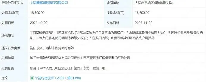 2023年10月25日,该公司曾因消防设施、器材未保持完好有效,被大同市平城区消防救援大队罚款1.85万元。