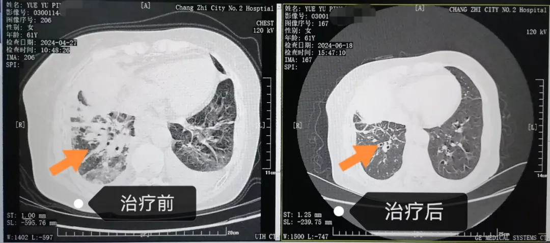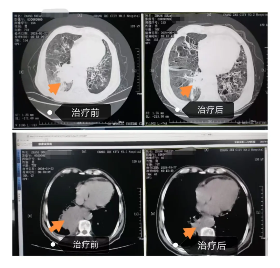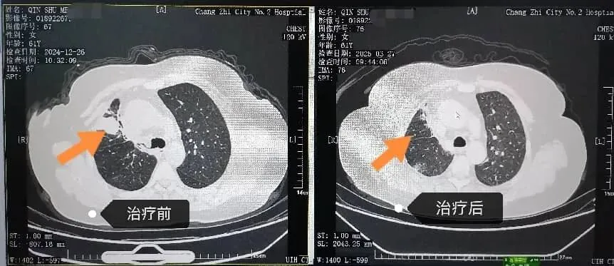 一位61岁女性,七年前腺癌术后复发,在一代靶向药显效多年后出现耐药。我们通过动态基因监测,及时捕捉到耐药信号,果断更换三代靶向药物。一月后,复查显示肿块显著缩小。体现了长治二院呼吸与危重症医学科“全程监测、精准序贯”的靶向治疗理念,将晚期肺癌转化为需要长期管理的慢性病。