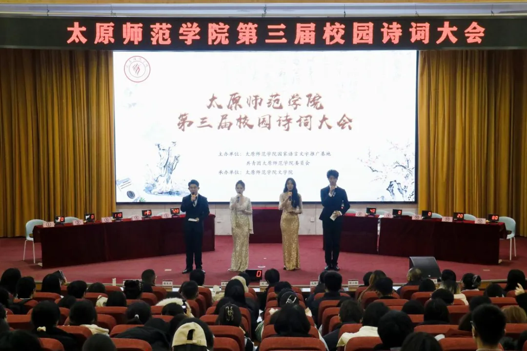 为传承中华优秀传统文化,引领师生感受诗词之美,提升学生语言文化素养,近日,国家语言文字推广基地(太原师范学院)举办第三届校园诗词大会决赛。活动在校图书馆会议厅进行,相关教师和学生现场观赛。