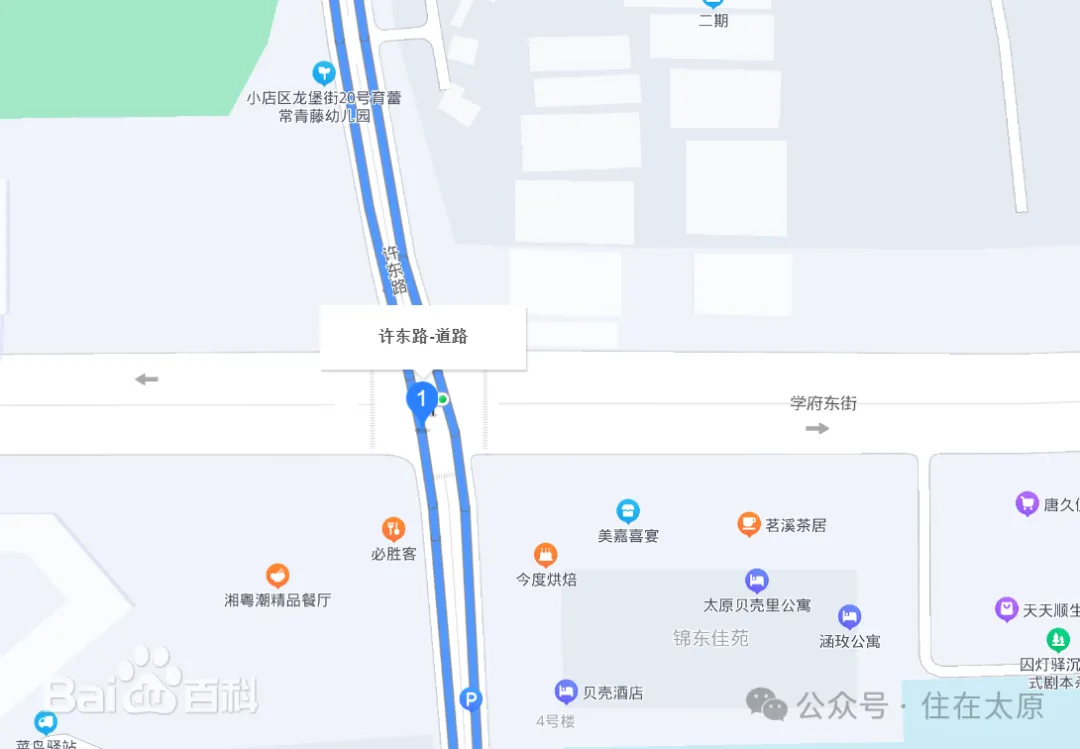 在小店区北营街道,有一条南北走向的城市支路——许东路,它北起龙堡街,南至许坦东街,全长约1095米,是连接东中环路西侧区域的重要通道。