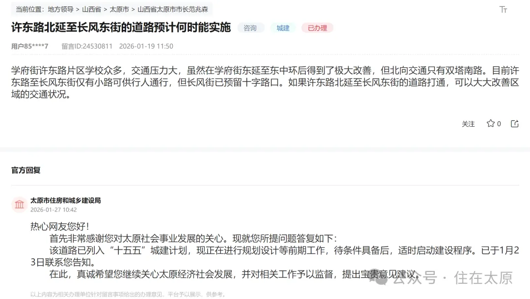 对于这一民众关切,官方给出了明确回复:该道路工程已正式列入太原市“十五五”城建计划,目前正在进行规划设计等前期工作,待条件具备后,将适时启动建设程序。