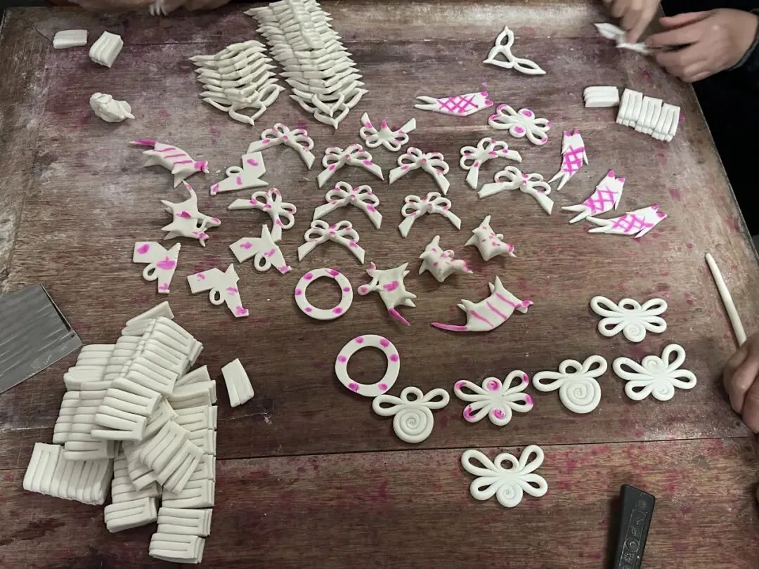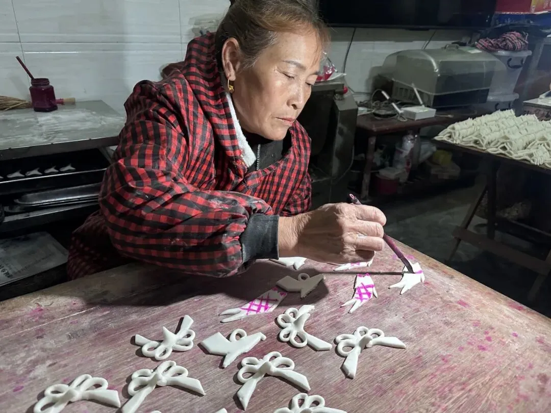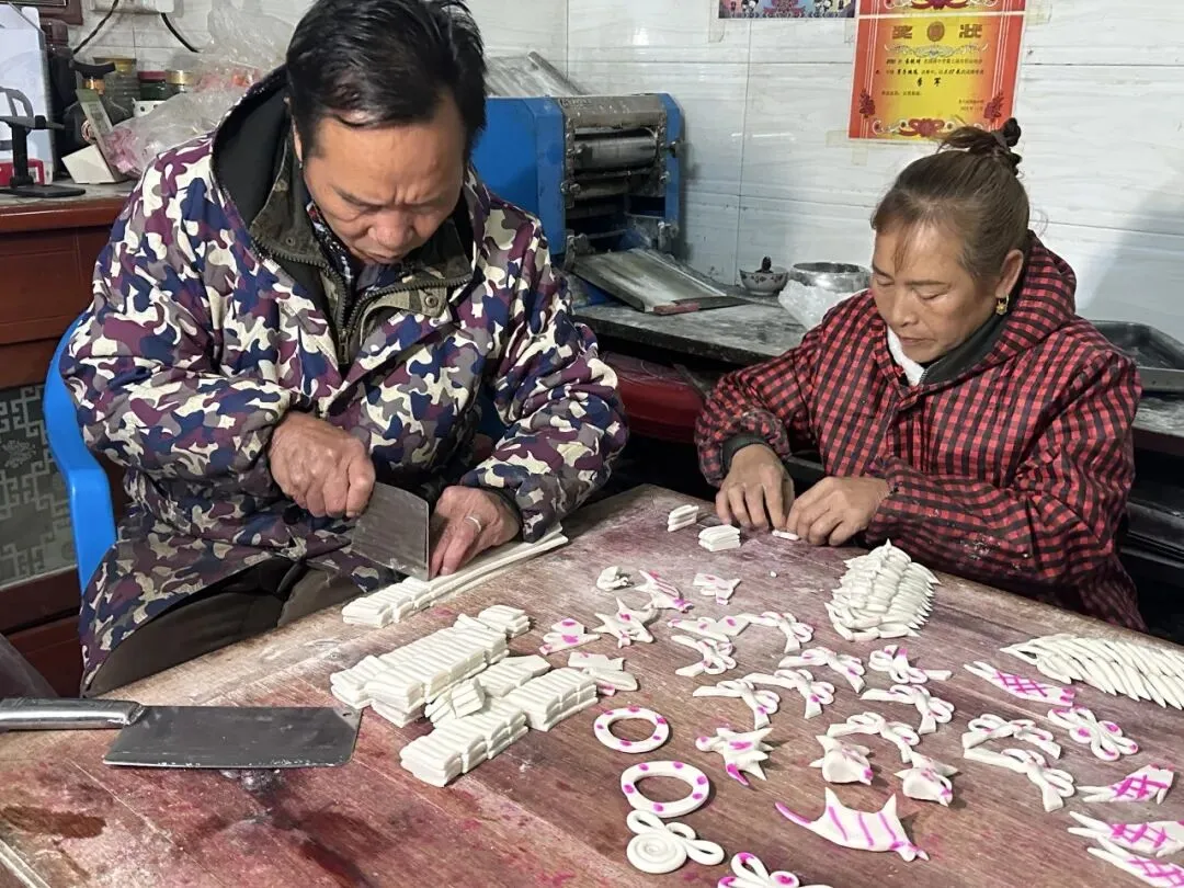 在袁杰家中,制作是一场温馨的接力:通常由袁杰亲手将米片切割成基础的几何形状,妻子韦爱宁和儿子儿媳则围坐一旁,手指翻飞间,将这些基础形状捏塑成一个个生动的形象。袁杰自幼便跟随爷爷学习这门百年家传技艺。如今,他和爱人韦爱宁一起,将这份承载着家族记忆的手艺,悉心传授给了儿子儿媳以及正在读书的孙辈。