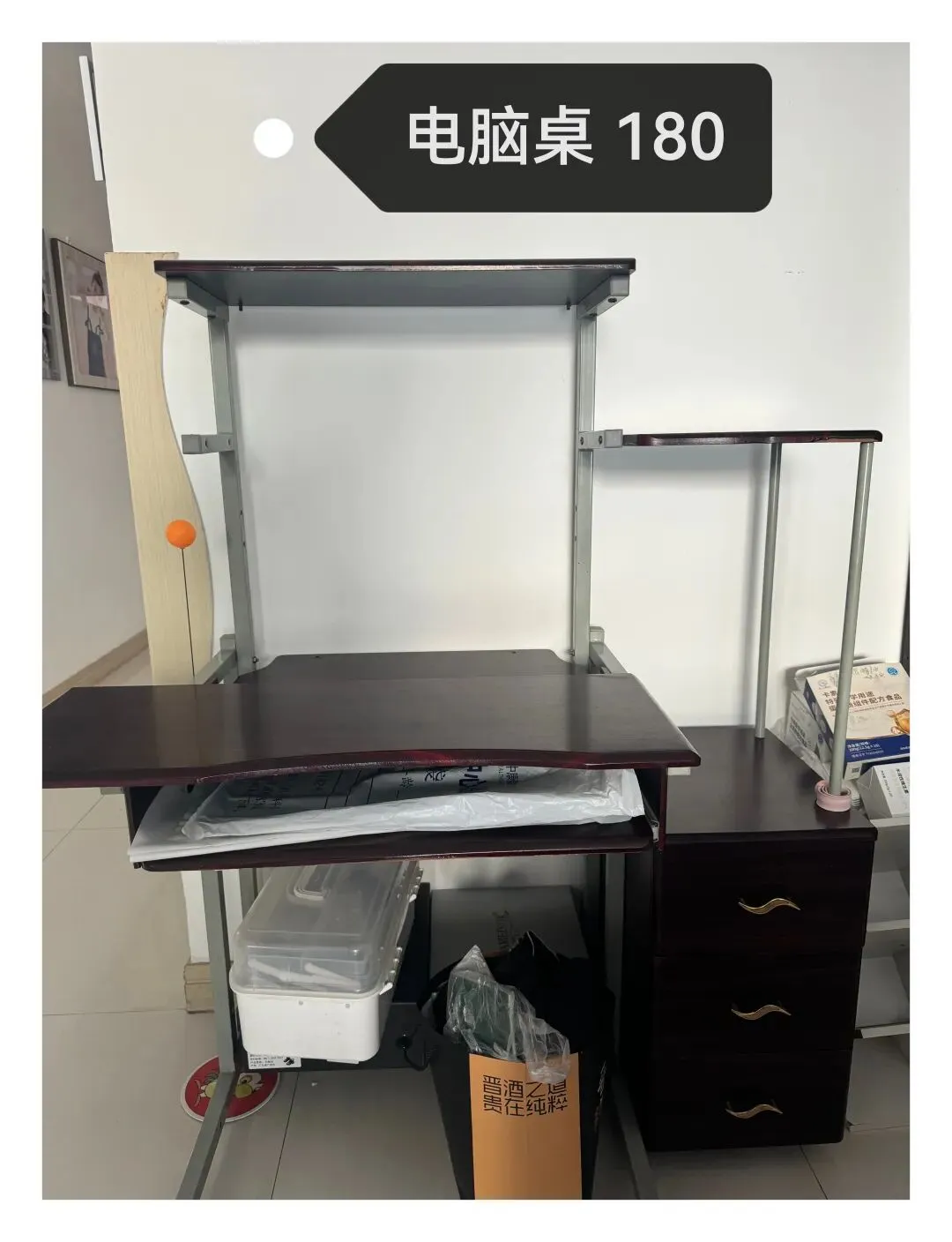 闲置实木电脑桌,长110cm,高130cm,宽56cm,带脚踏板,右边有3个抽屉,下面有储物空间,实木桌面,结实耐用。桌子有点小瑕疵,整体成色还可以,适合家用或办公。只支持同城自提,价格可聊,欢迎私聊看实物,可小刀。☎:13834588656