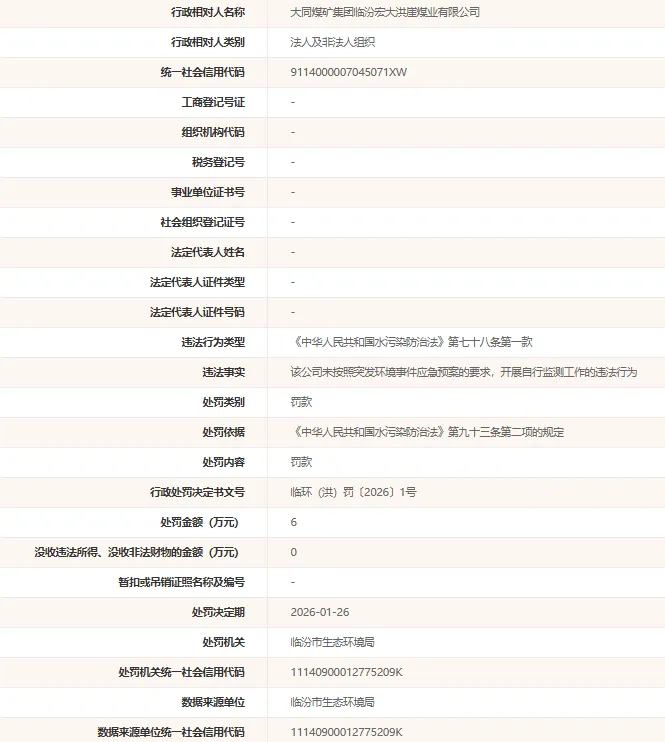 >大同煤矿集团临汾宏大洪崖煤业有限公司被罚款6万 因为...
