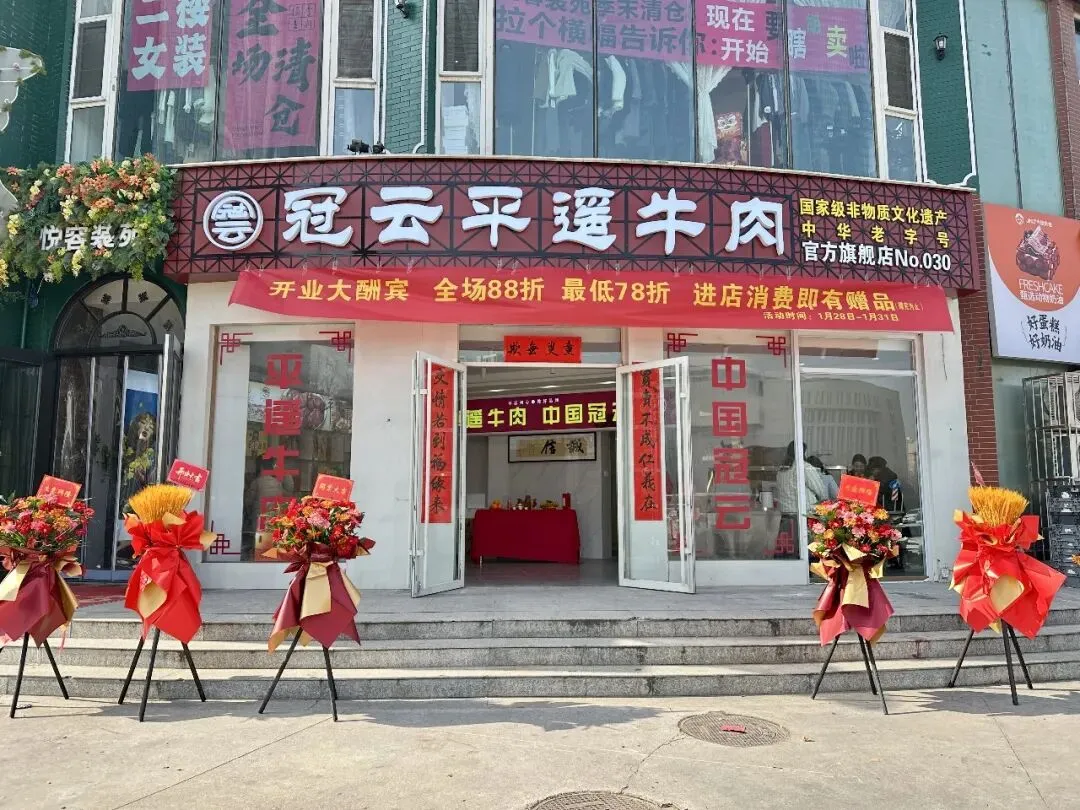 冠云平遥牛肉官方旗舰店于2026年1月28日盛大开业,该店属于工厂直营店,地址位于太原市晋源区长兴南街58号。