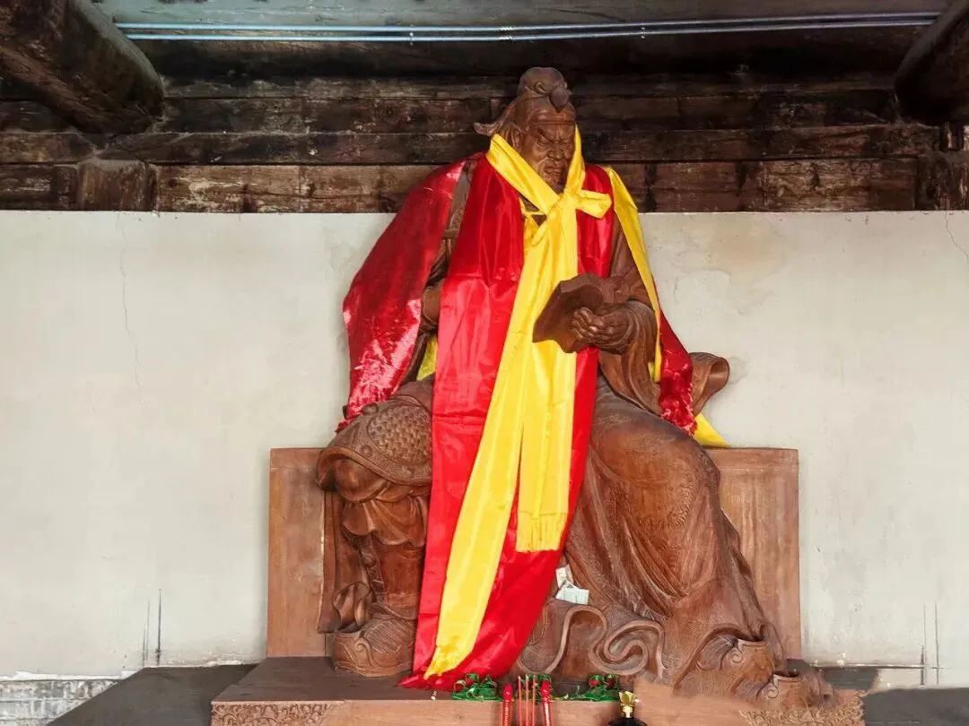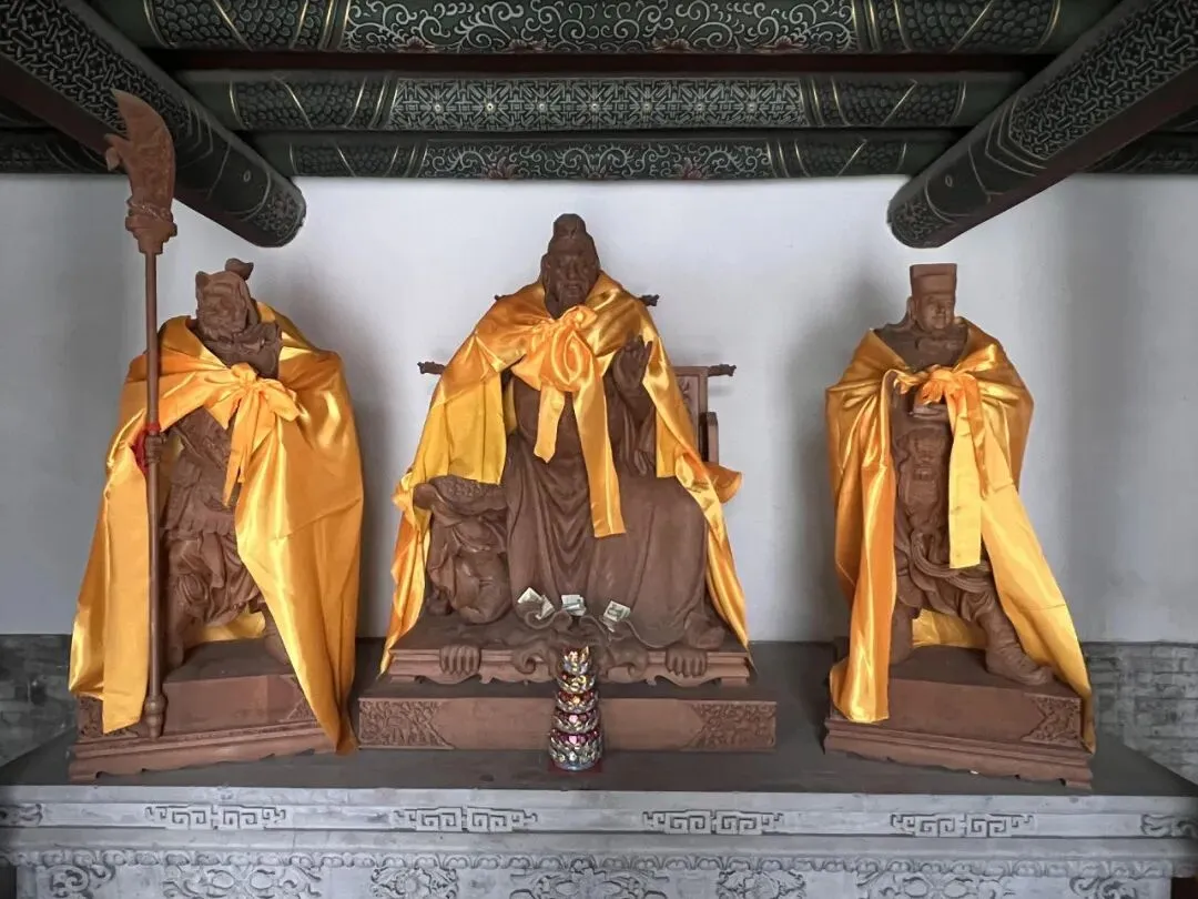 中院正殿砖砌台基,二层楼阁式建筑,面阔五间,进深三间,单檐悬山顶,前出廊。一楼是关公、周仓、关平的木质雕像,风格和校尉营关帝庙正殿塑像很接近,二楼则是关羽夜读《春秋》木质雕像,这可能是原本的春秋楼。献殿里有一尊面塑关公像非常细腻精致,是忻州市非遗传承人、工艺美术大师卢佩宏的作品。