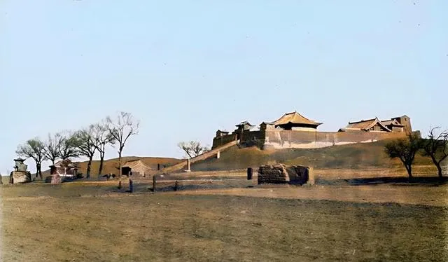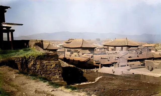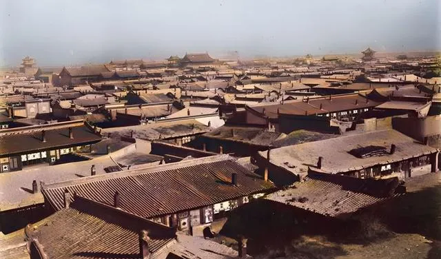 这张是俯瞰,大屋小屋挤在一起,瓦片和灰土一个色,屋顶上立的小烟囱一圈一圈,有的在冒烟,有的不冒,冬天里家家烧炕,晚饭点火那会儿,整个城像披了层薄薄的雾。