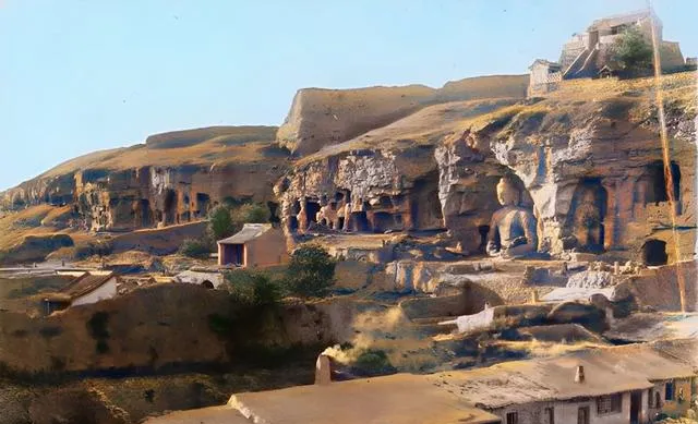 这个山坡上密密麻麻的洞就是云冈石窟,洞口像张开的嘴,边缘没修饰的那种粗,石壁有被工具划过的痕,小时候第一次去,爸妈让我小点声,说这地方要轻点走路,别惊扰了石头里的神明。