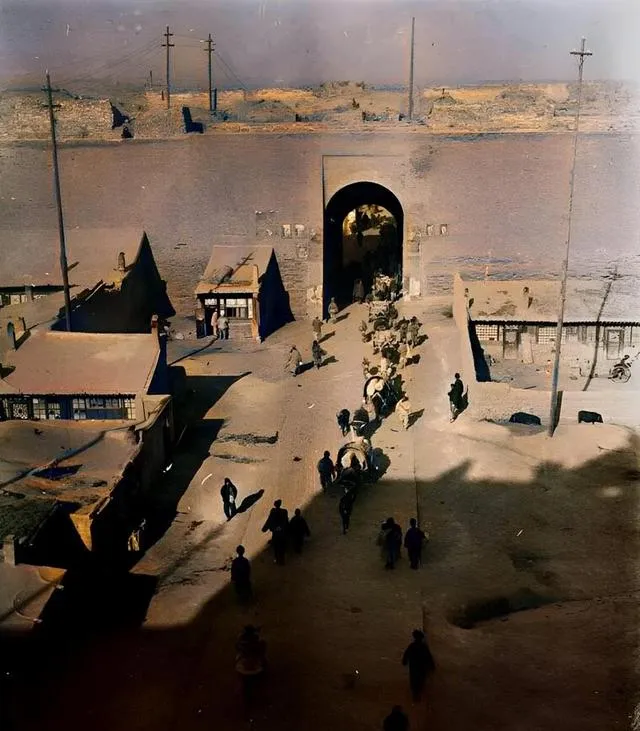 这个城门外,电线杆刚立起来,城墙的皮子被风刮得发白,人流从门洞里鱼贯而入,有人骑驴,有人推车,孩子跟在大人后头跳着脚往里挤,像赶集一样忙活。